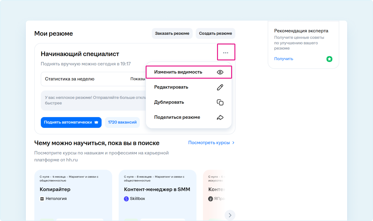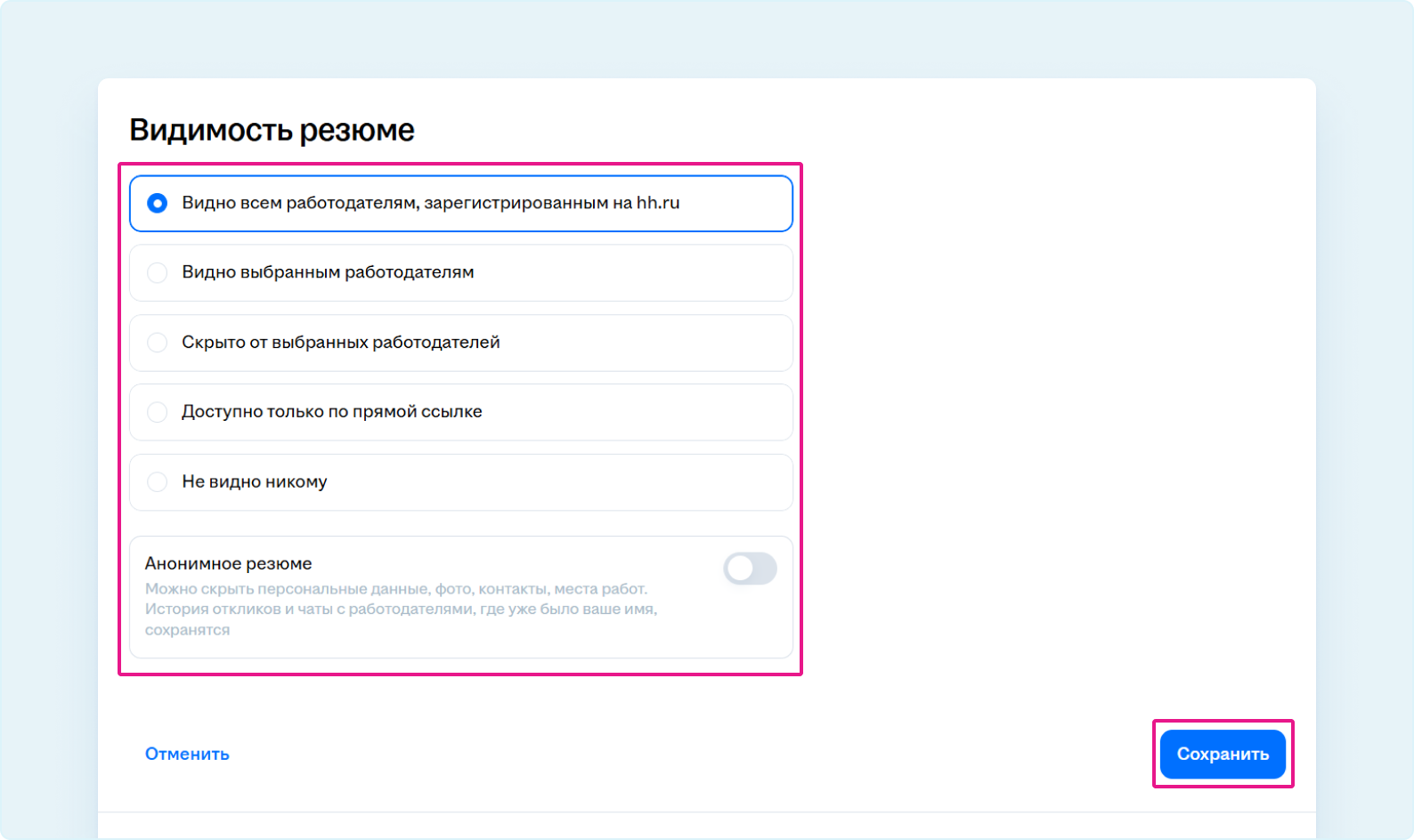Читайте подробнее о настройках видимости и анонимном резюме.