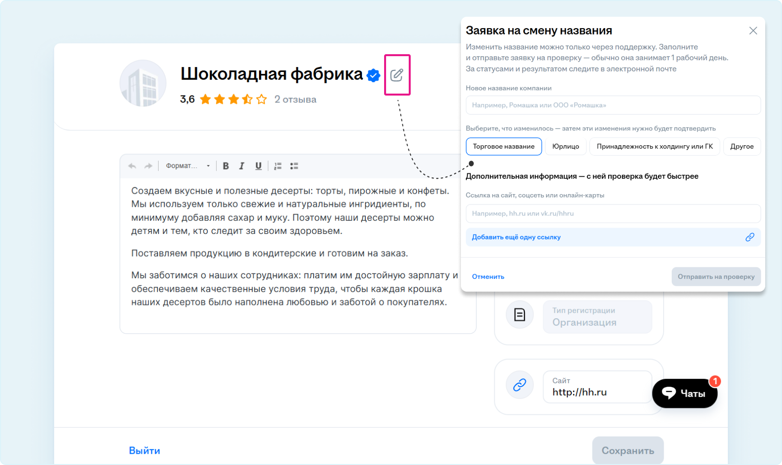 - Нажмите на значок карандаша ✎ рядом с текущим названием компании.