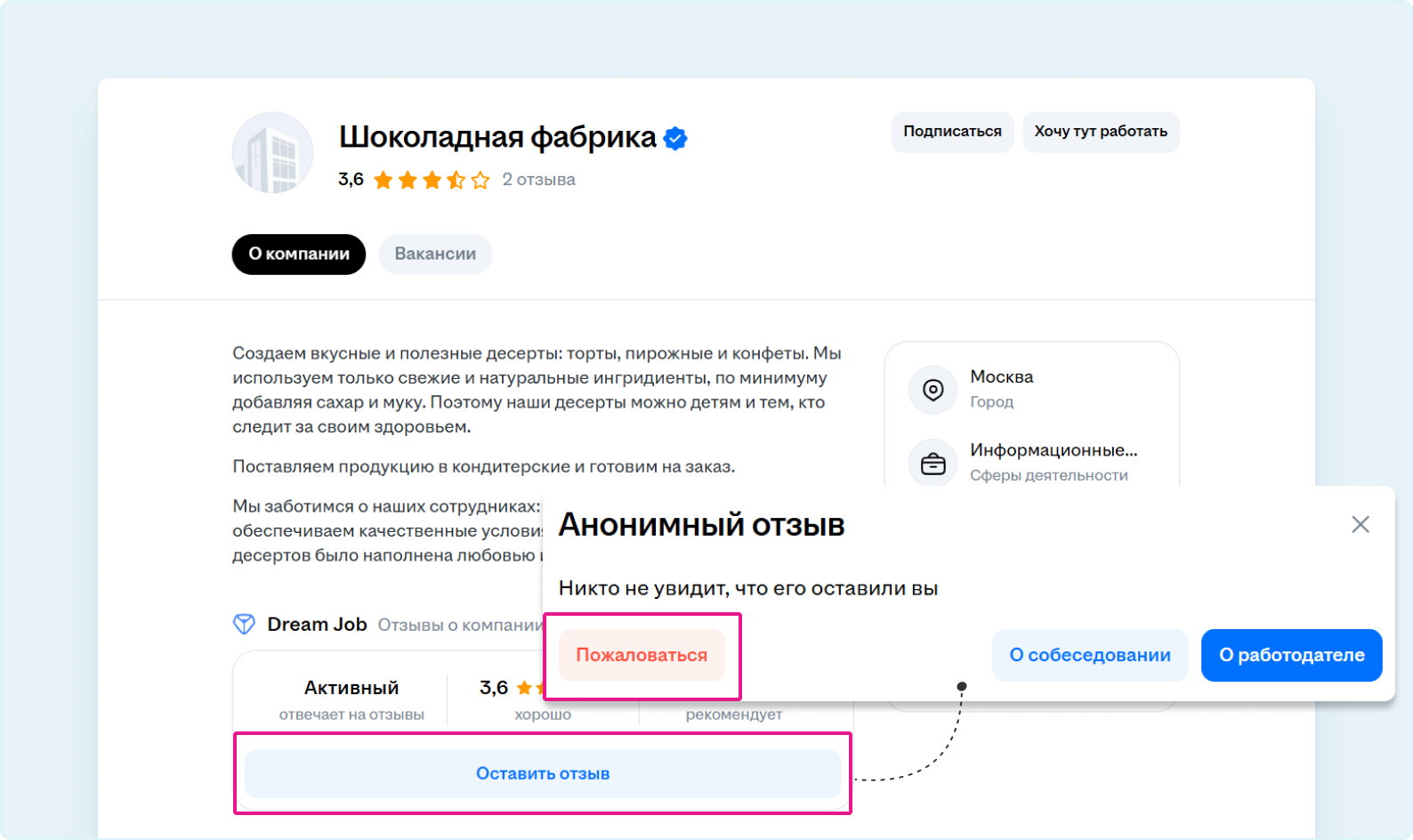 1. Если вы хотите пожаловаться на работодателя или компанию, зайдите на страницу компании и нажмите «Оставить отзыв».