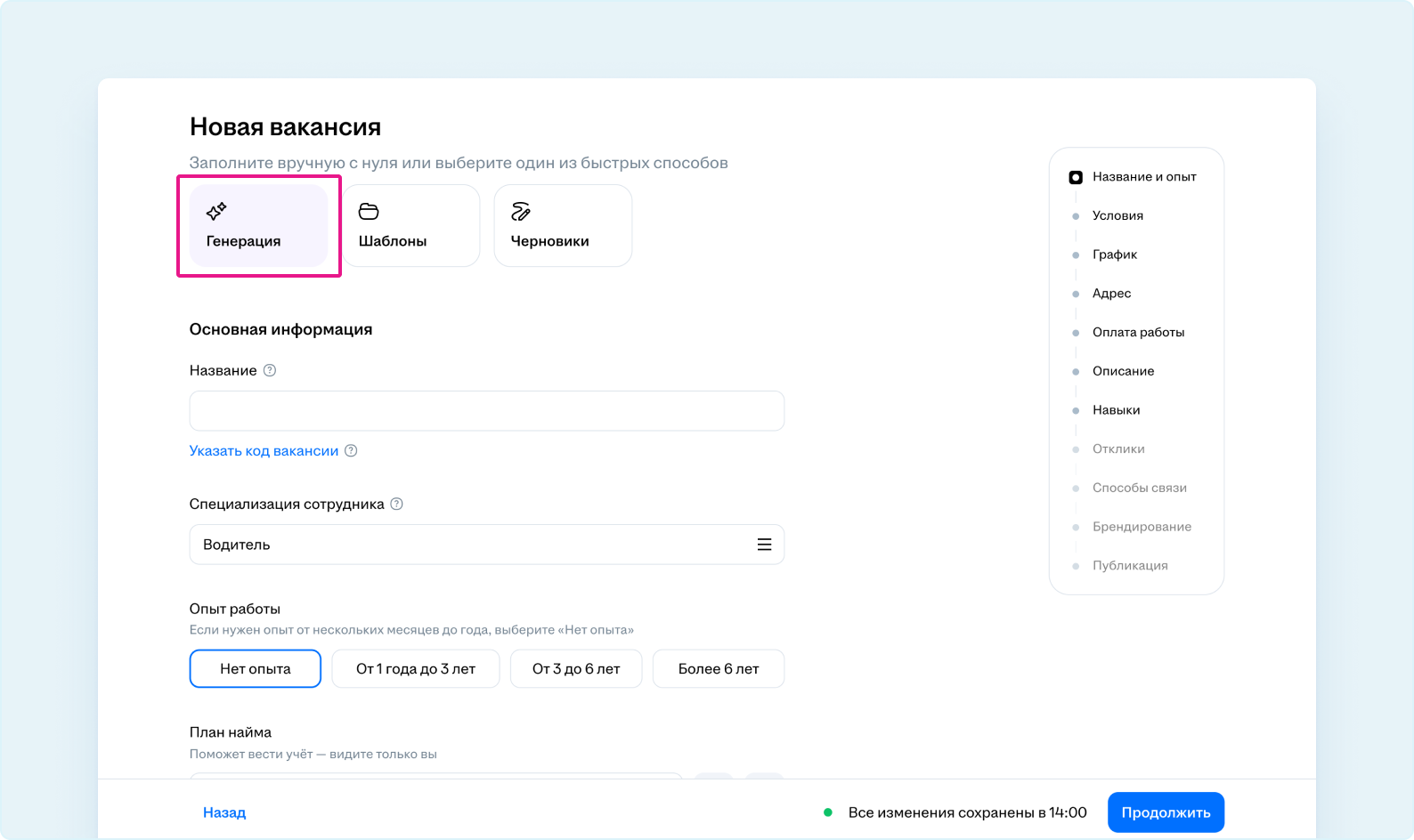 - Система откроет конструктор вакансий, где все основные поля будут уже заполнены.