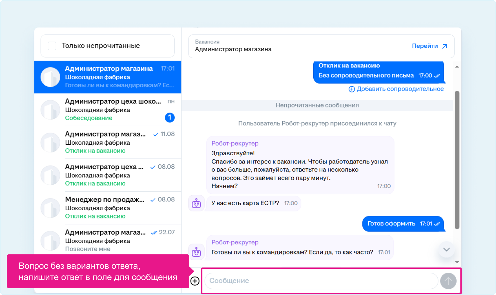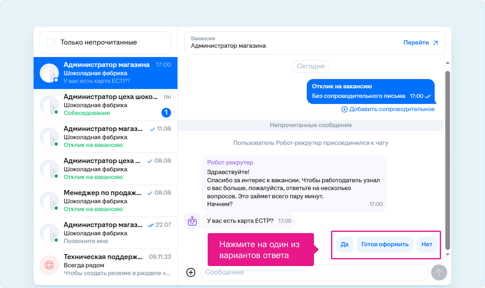 2. После отклика на такую вакансию система перенаправит вас в чат с работодателем.Подробнее о том, как откликнуться на вакансию.