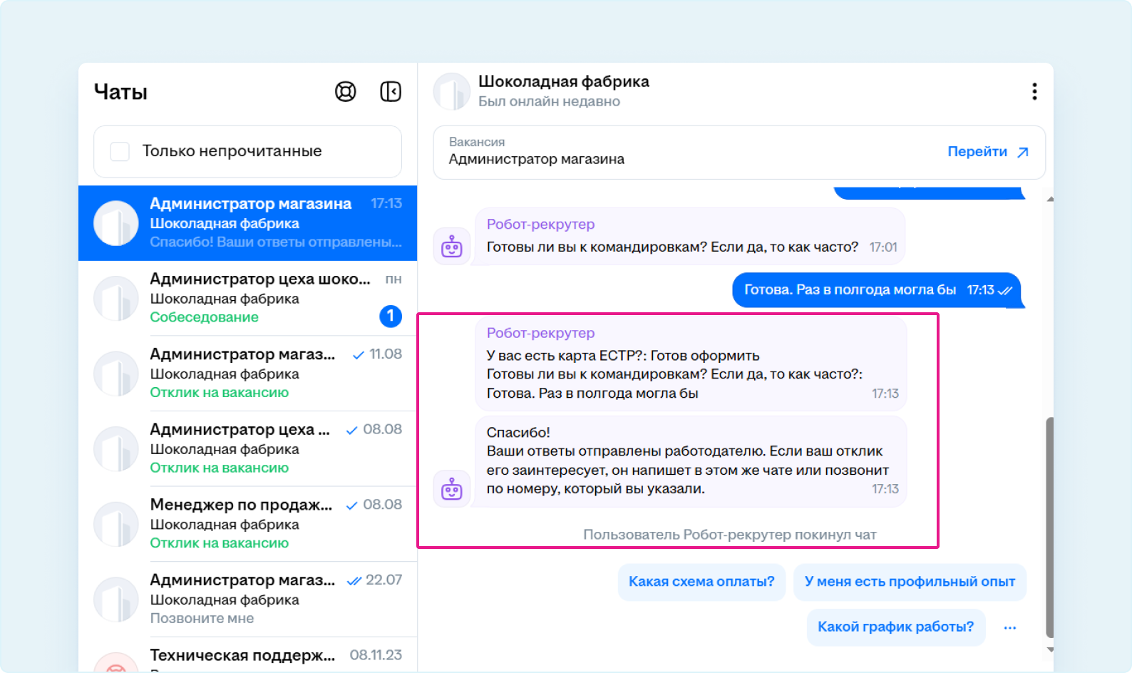 По окончании автоопроса вы увидите сообщение от робота рекрутера и уведомление «Пользователь Робот-рекрутер покинул чат».