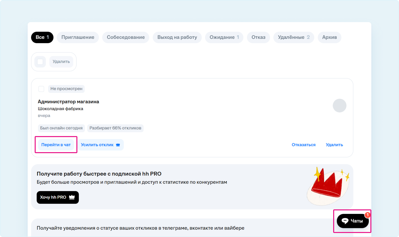 - В разделе «Отклики и приглашения» найдите нужный отклик и нажмите кнопку «Перейти в чат».