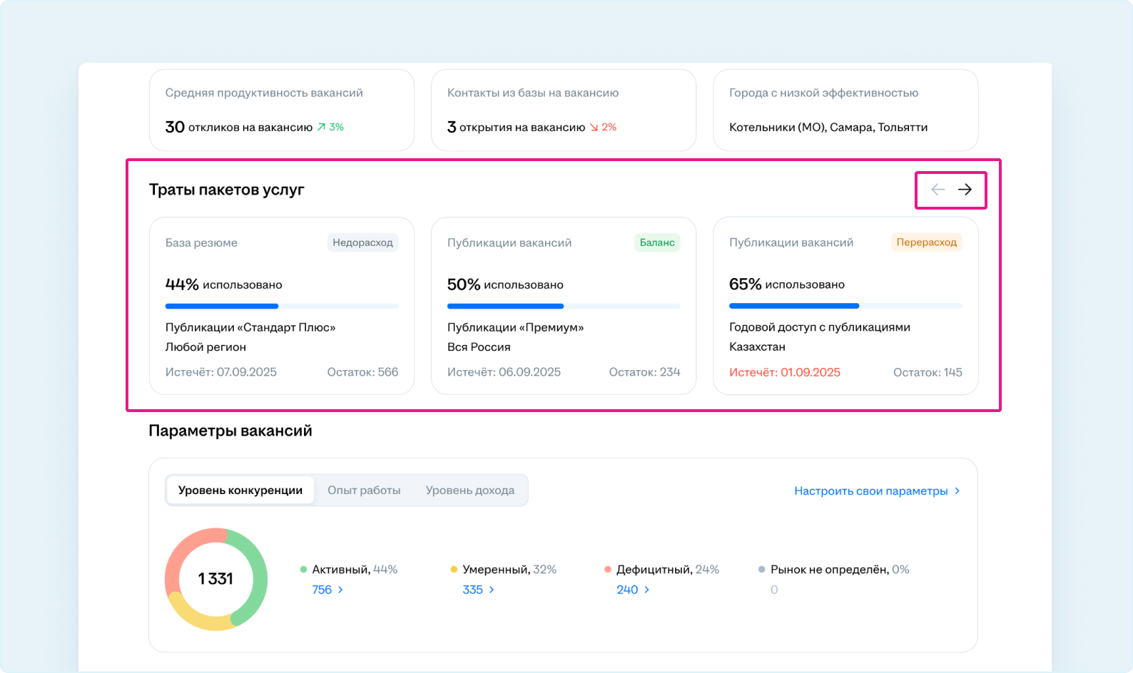 - Траты пакетов услуг — информация об использовании пакетов публикаций и открытий контактов, прогноз расхода до конца срока действия;