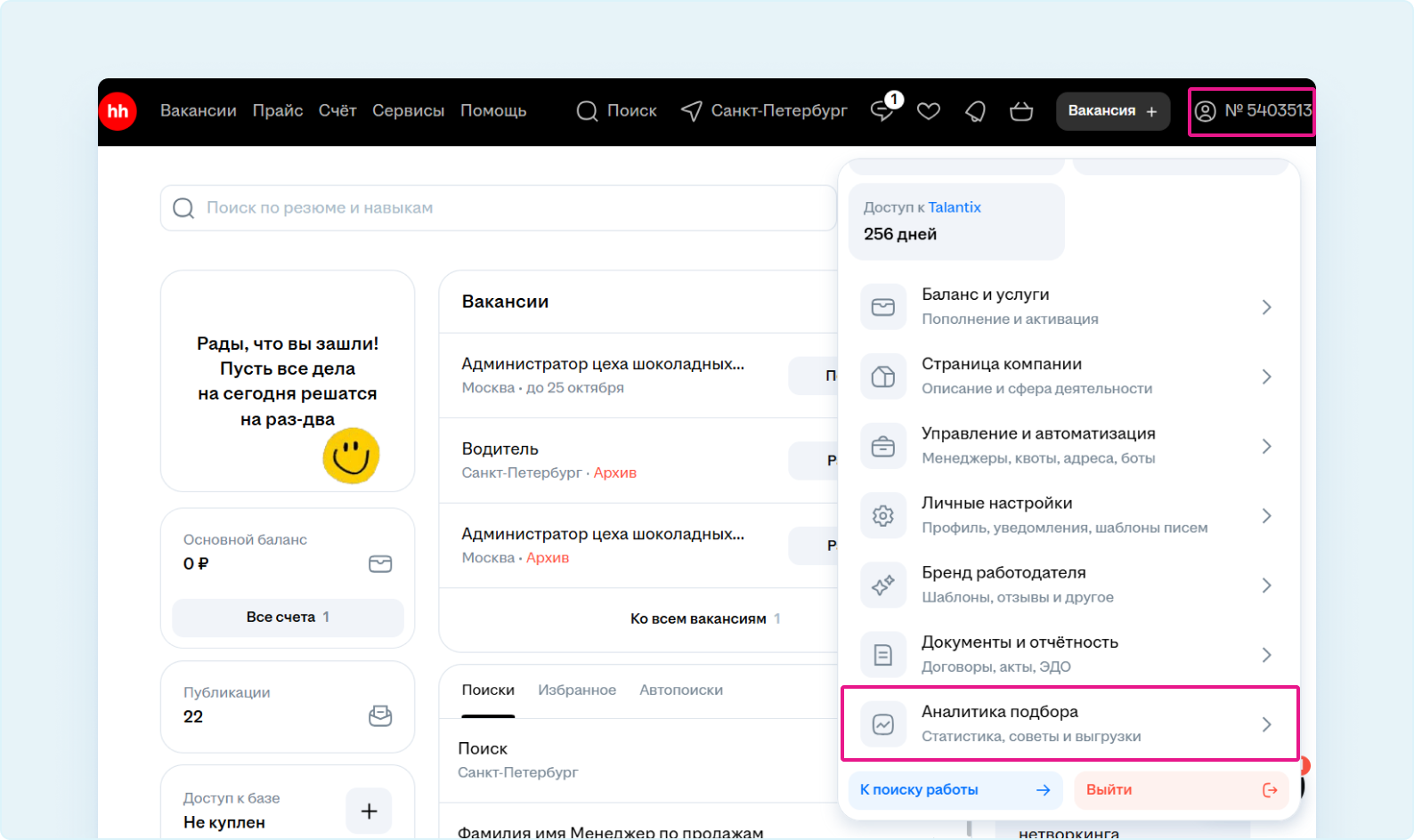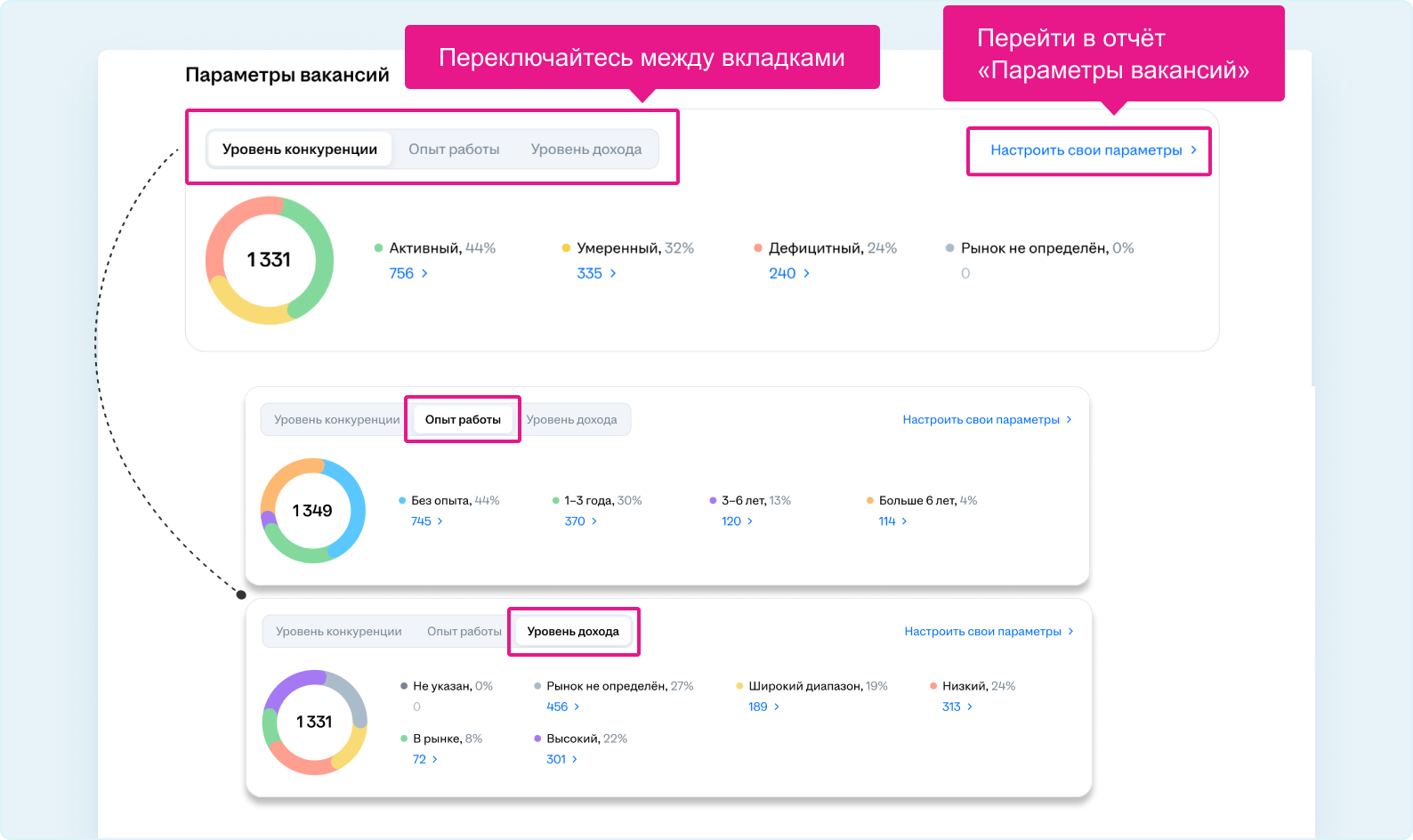 Важно: сумма вакансий «с откликами» и «с резюме из базы» может быть больше, чем общее число активных вакансий. Это потому, что одна и та же вакансия может одновременно получать и отклики, и приглашения из базы резюме.
