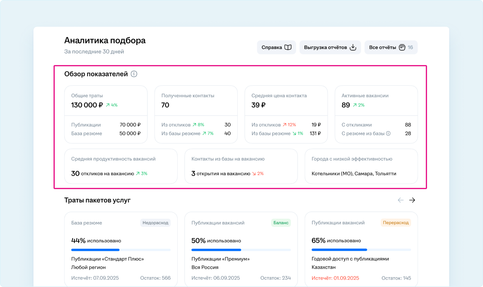 - Обзор показателей — ключевые метрики за последние 30 дней: траты, контакты, стоимость контакта, активные вакансии, продуктивность, города с высокой стоимостью подбора;