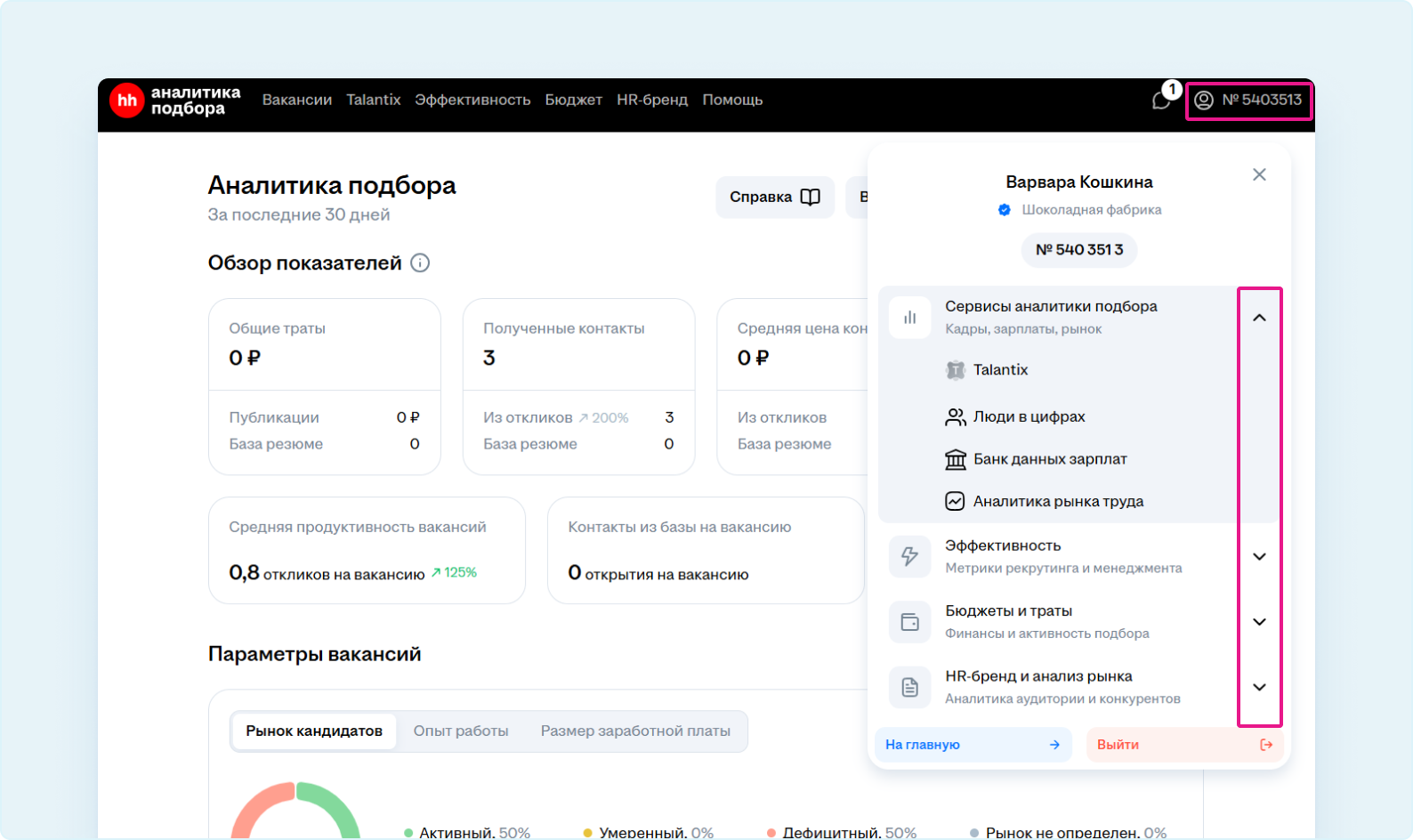 2. На странице «Аналитика подбора» нажмите на клиентский номер, чтобы открыть навигационное меню. Здесь вы найдёте все инструменты аналитики для работодателя на hh.ru и дополнительные сервисы.