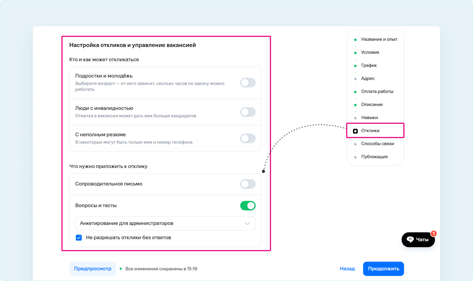 - Если хотите отключить чат с соискателем — отключите опцию «Разрешить переписку в чате».