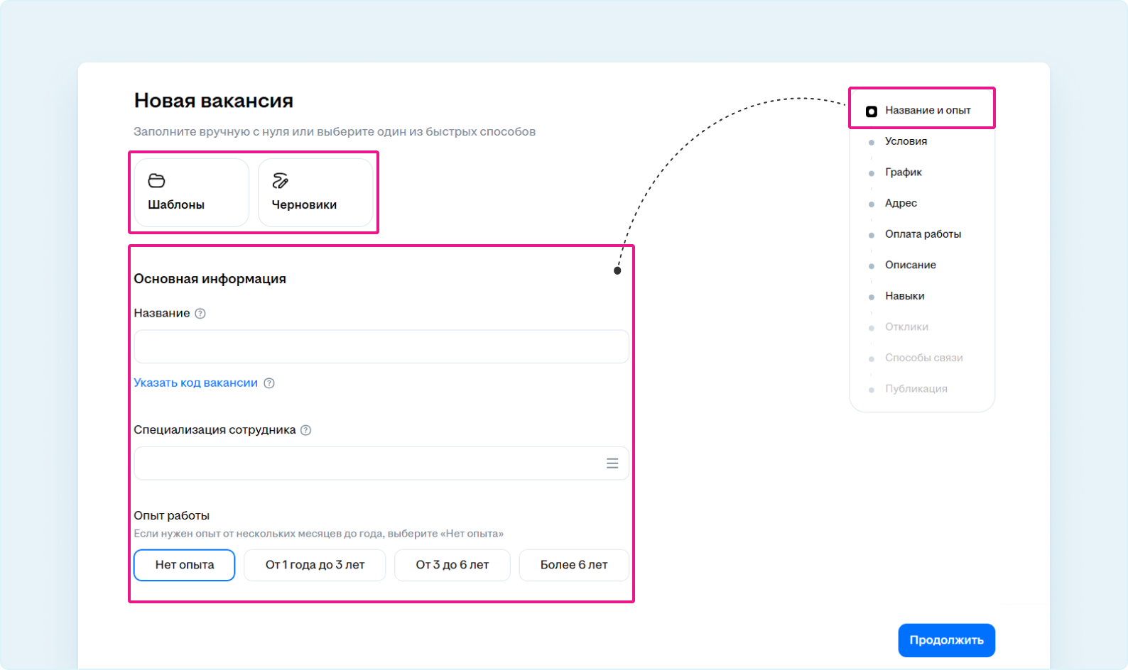 Нажмите «Продолжить», чтобы перейти к выбору параметров публикации вакансии.