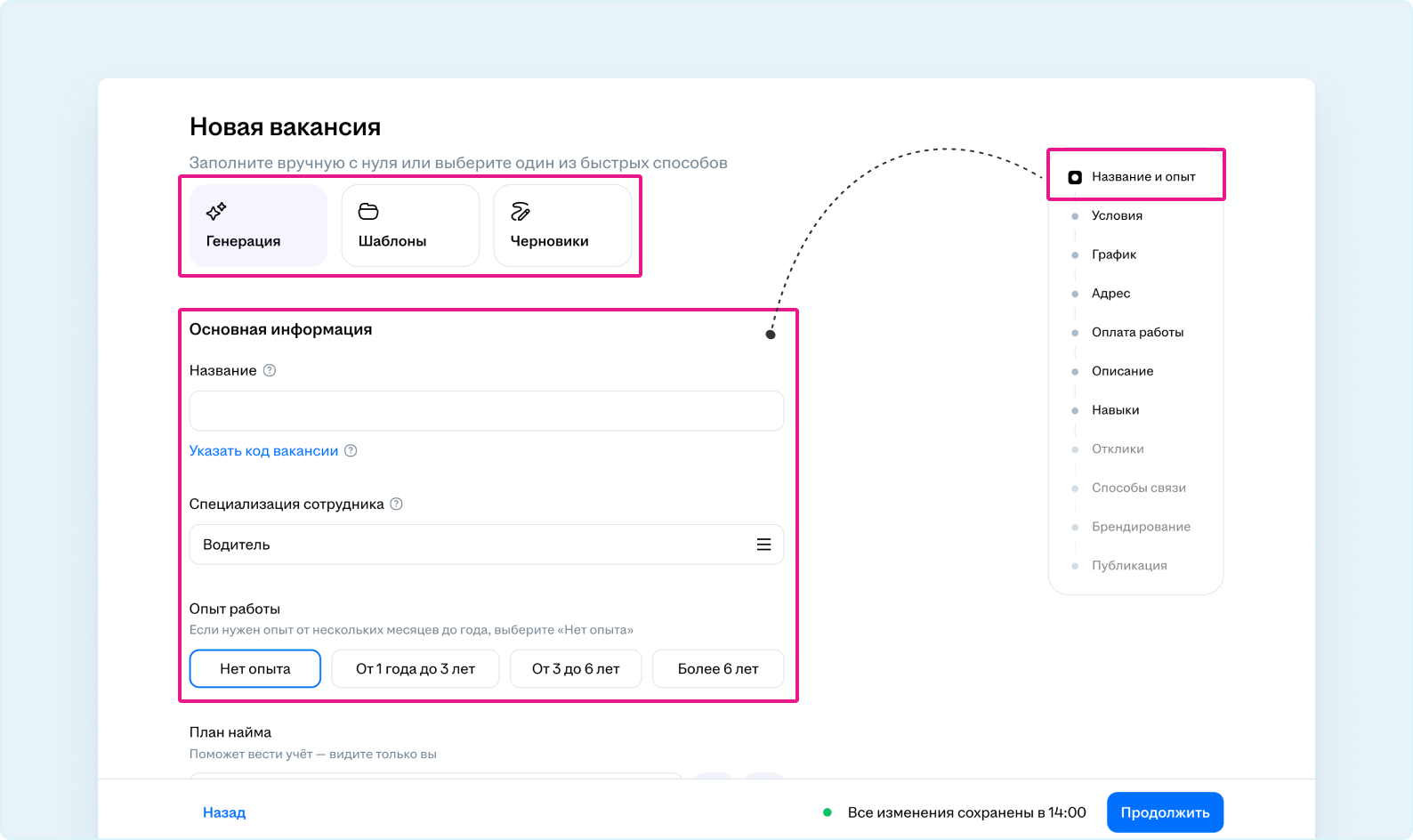Все изменения сохраняются автоматически. Если вы не заполните вакансию до конца, то сможете продолжить создание вакансии позже в разделе «Черновики».
