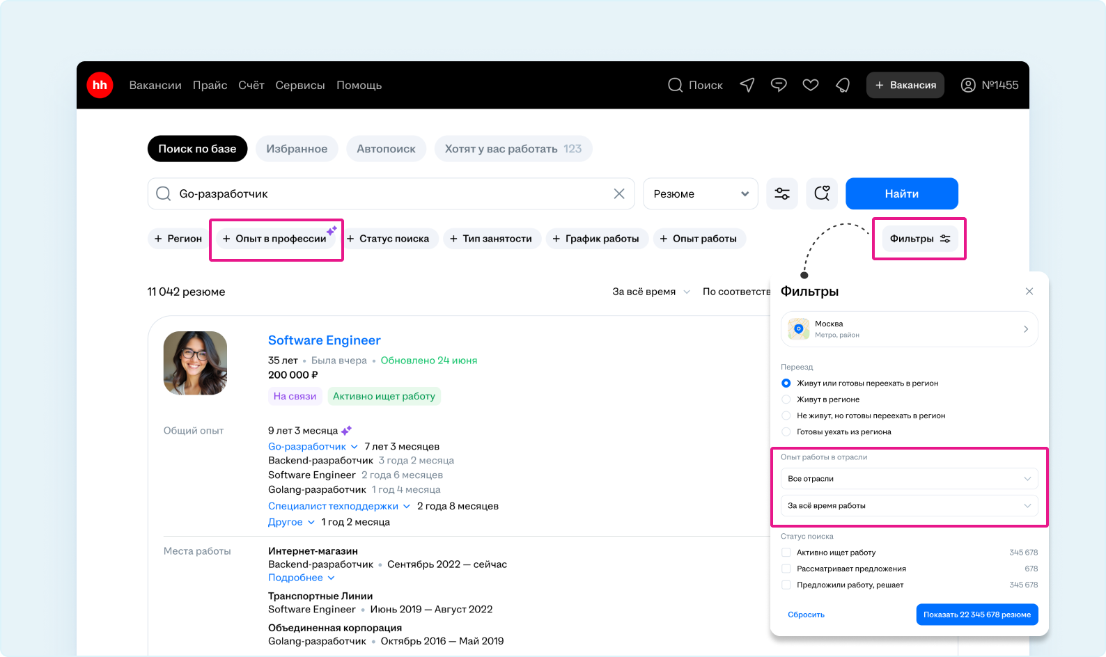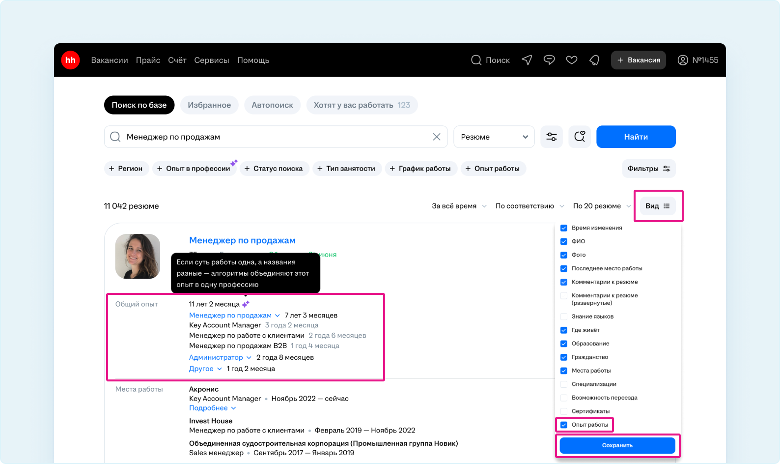 Мы запустили алгоритм, который автоматически определяет и суммирует опыт работы соискателя — даже если должности в резюме называются по-разному. Вместе с ним появился фильтр, который помогает выбрать кандидатов, чей опыт в профессии удовлетворяет требованиям вакансии.
