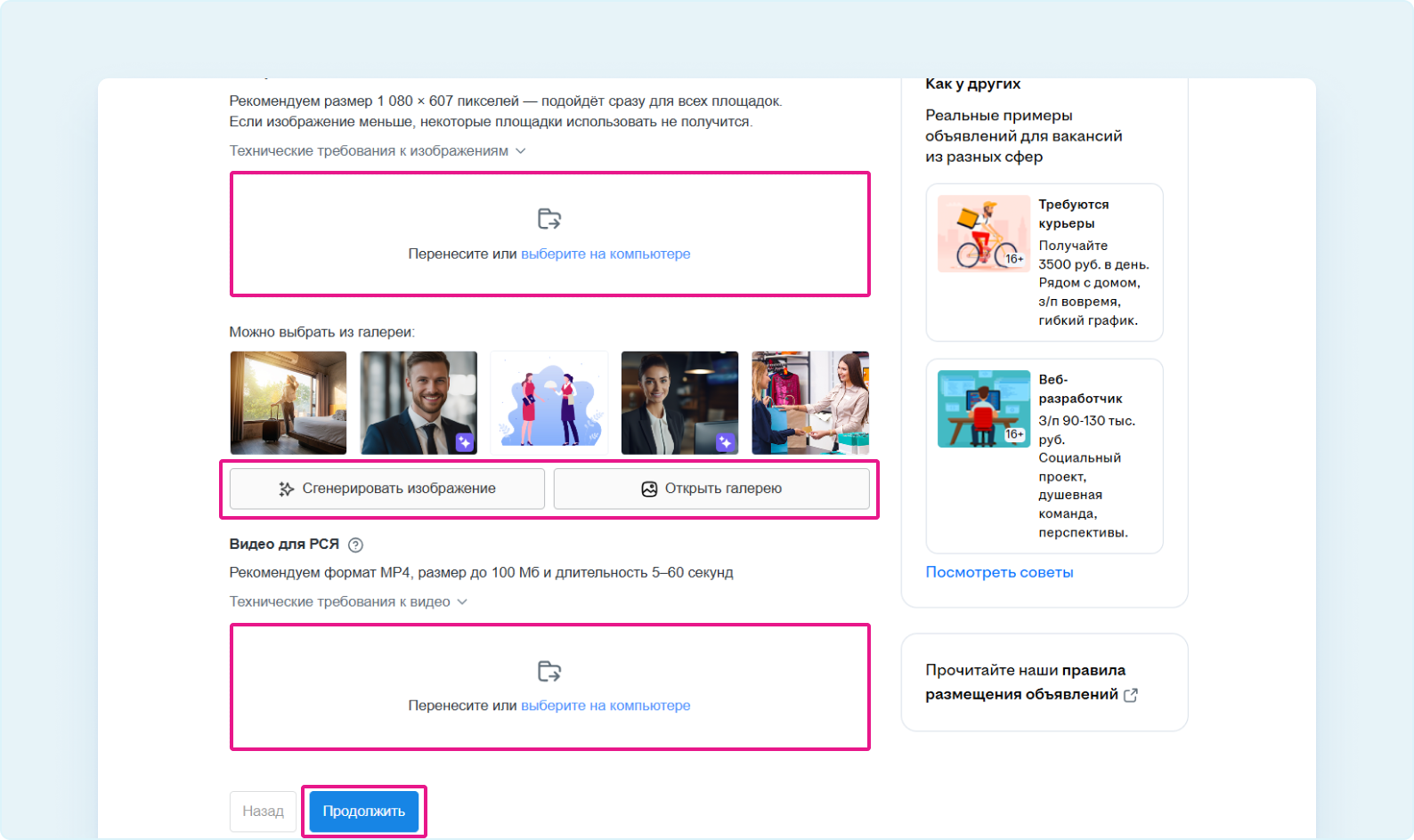 Здесь же вы можете сгененировать изображение для своего рекламного объявления.