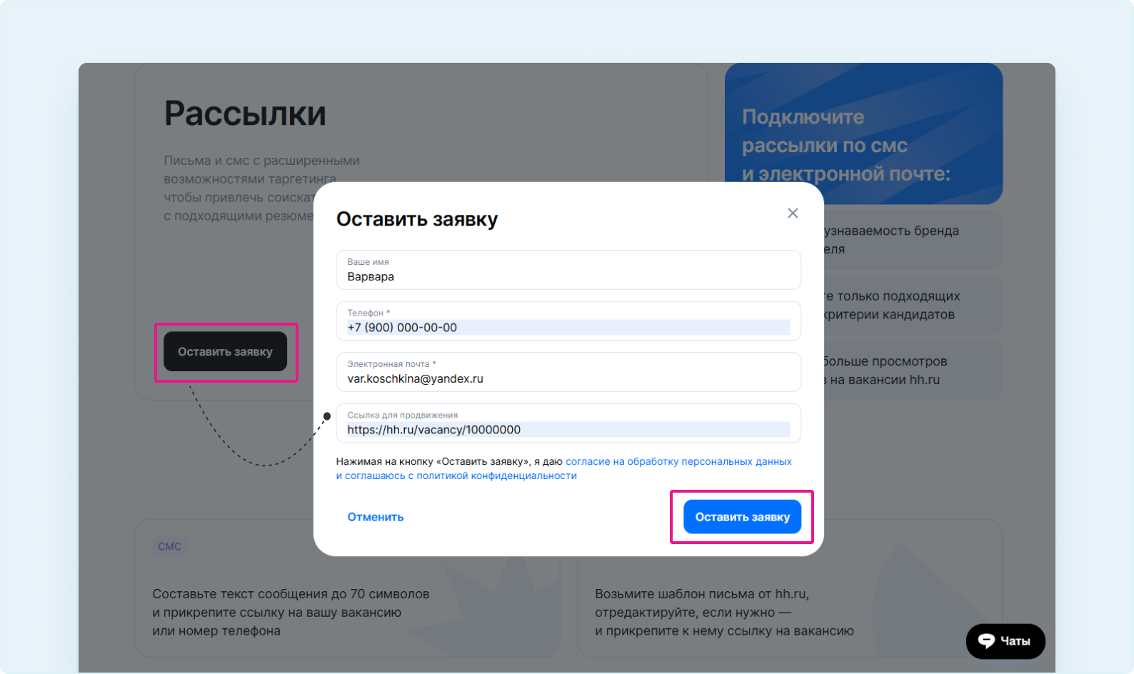 1. В данном типе рассылки не допускается указания номера телефона или других контактов — только ссылка на вакансию или чат-бот hh.ru.