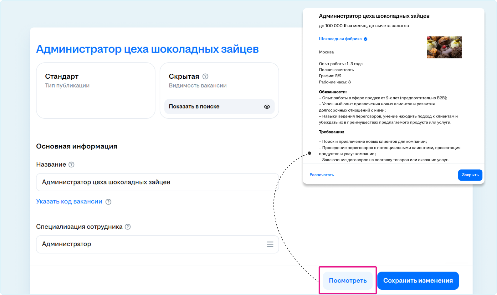 Закончив редактировать вакансию, вы можете посмотреть, как она будет отображаться для соискателя. Для этого нажмите «Посмотреть» — в новом окне откроется предпросмотр вакансии с изменениями, которые вы уже внесли, но не сохранили.