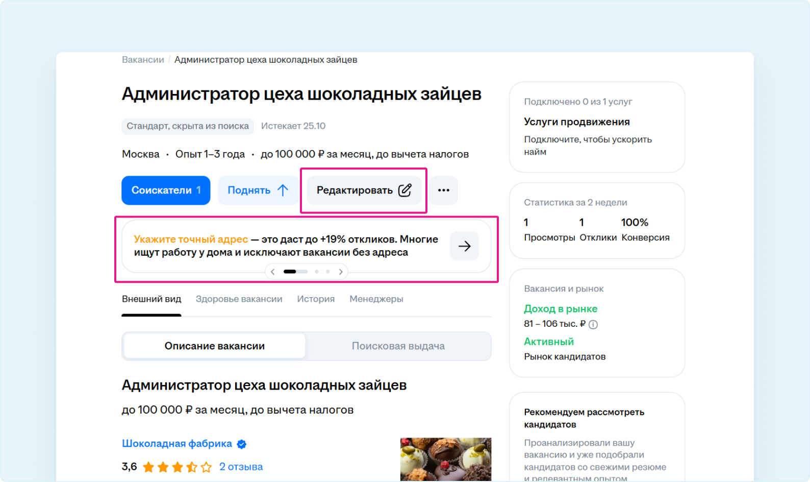 Обратите внимание на блок с рекомендациями по улучшению вакансии.