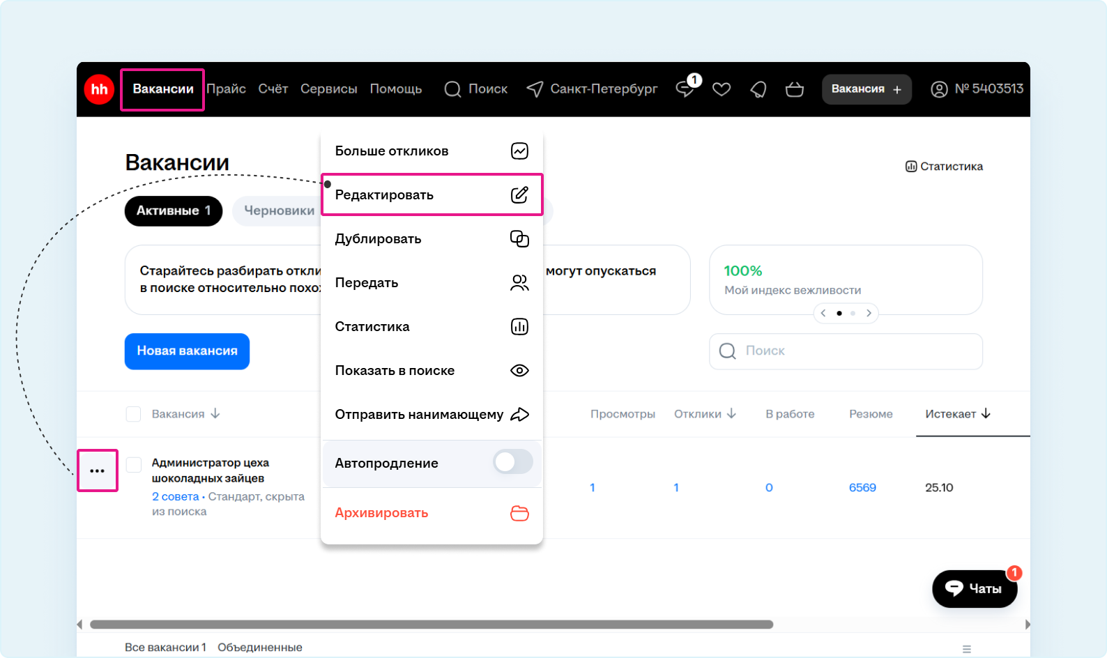 2. Наведите курсор на название нужной вакансии, нажмите на три точки слева и выберите «Редактировать».
