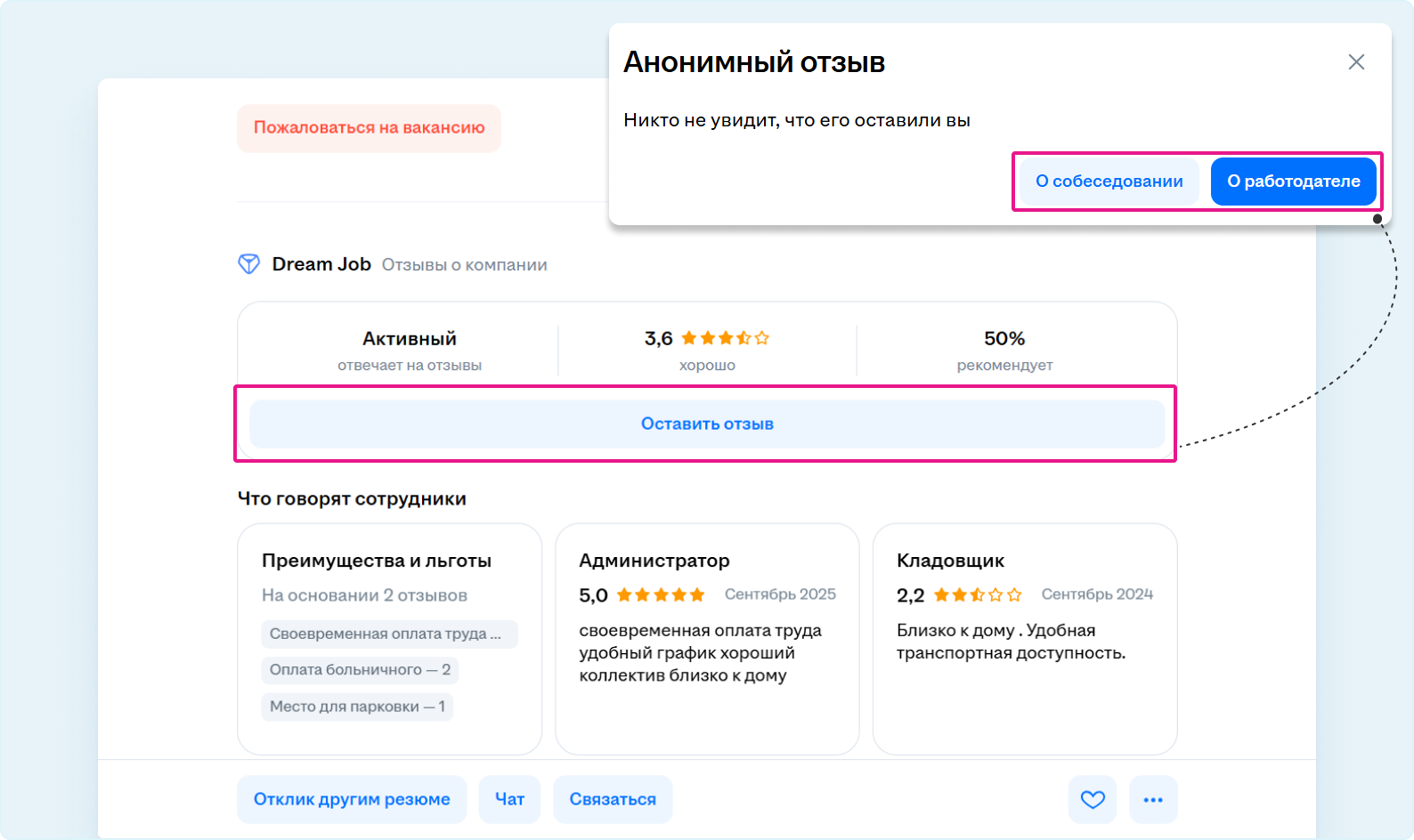 Оставить отзыв со страницы вакансии