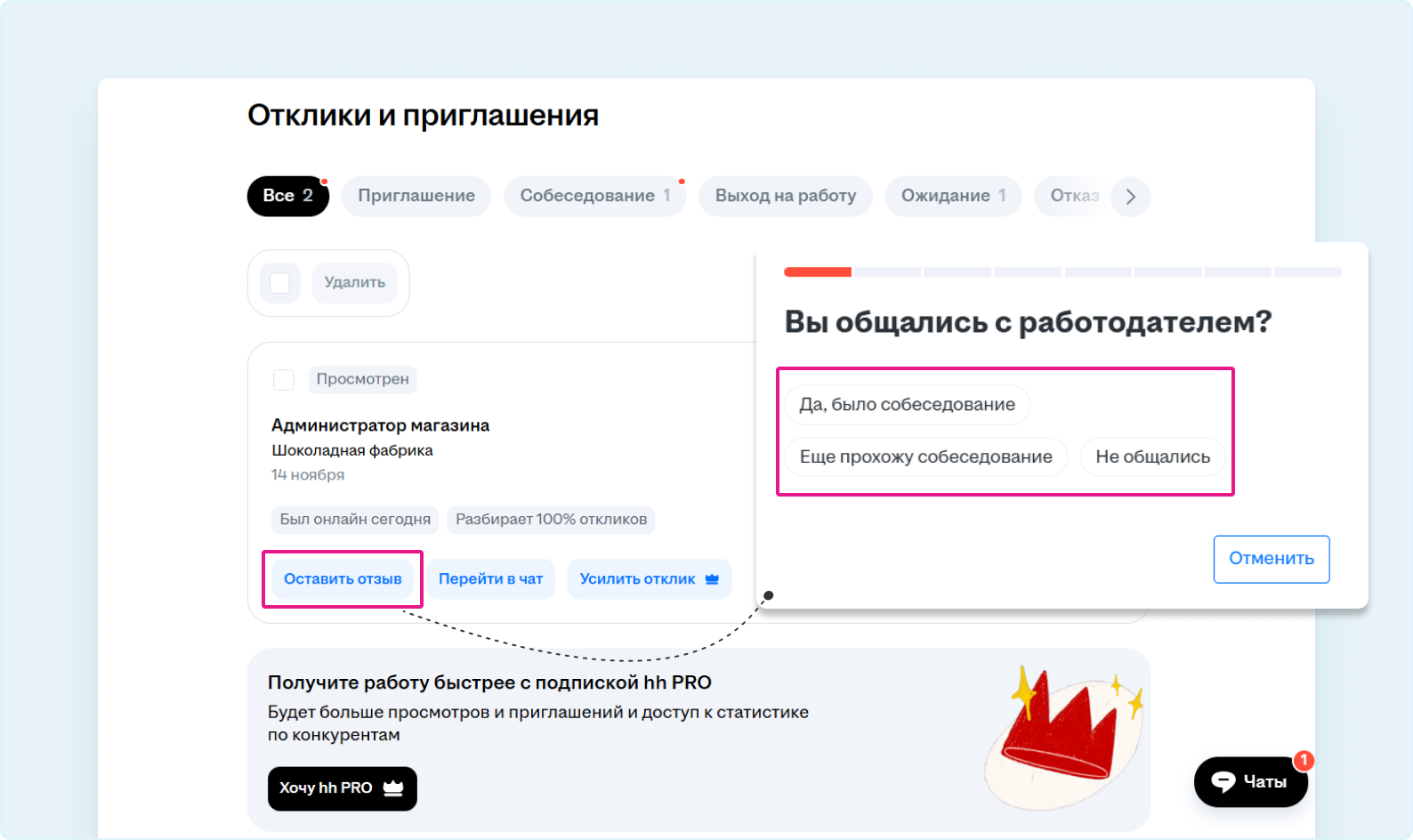 1. На странице с вашими откликами вы можете оставить отзыв о собеседовании в компании.
