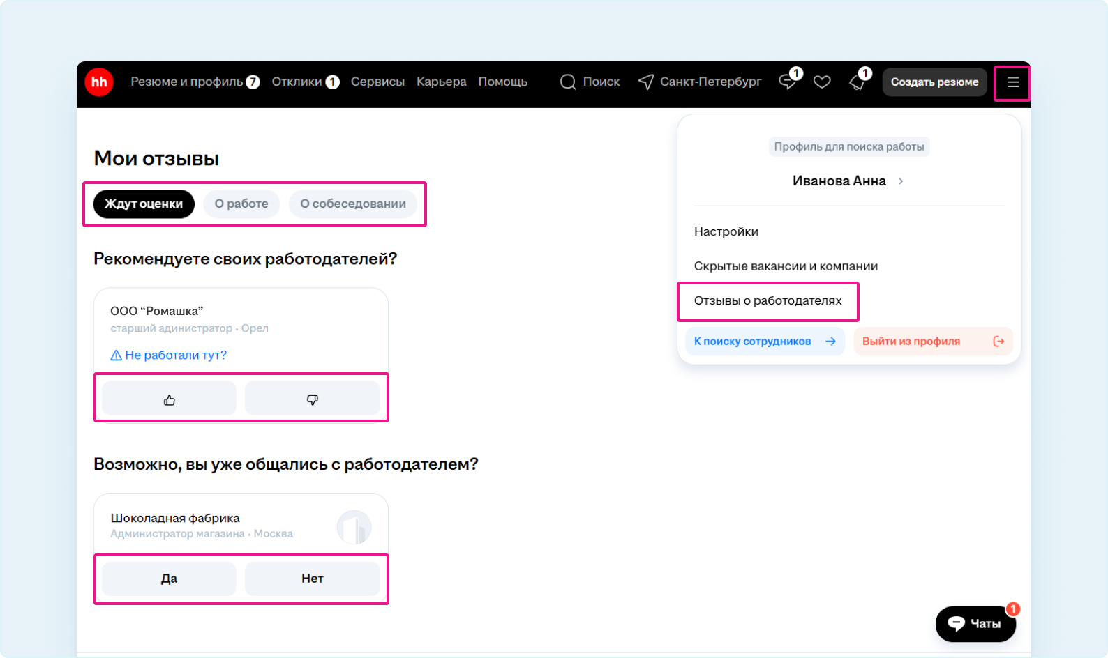 Система предложит вам оставить отзыв о работодателях, которых вы указали в своём резюме в опыте работы, а также о компаниях, с которыми вы могли общаться после приглашения на вакансию.