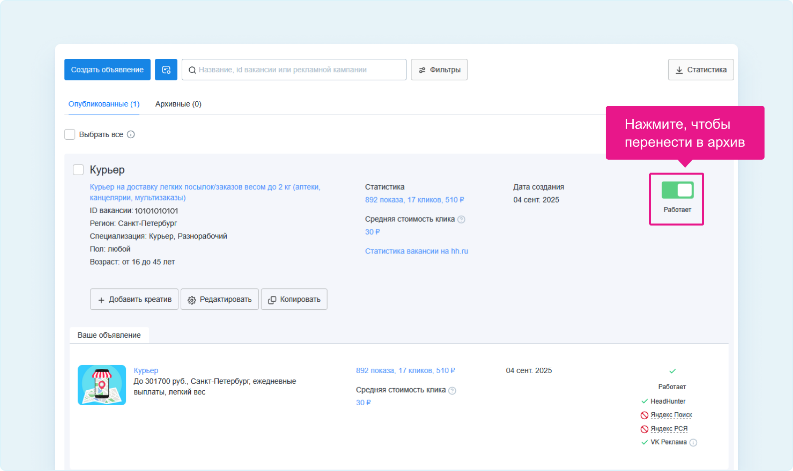 1. Перенесите в архив все кампании, которые отображаются в кабинете Clickme как опубликованные.