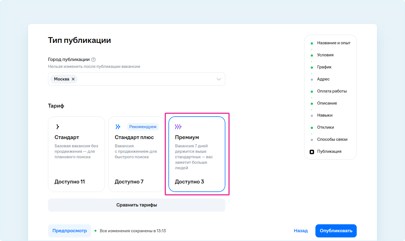 Или же выберите тариф «Премиум» и оплатите его на странице публикации вакансии (в этом случае вы увидите стоимость публикации).