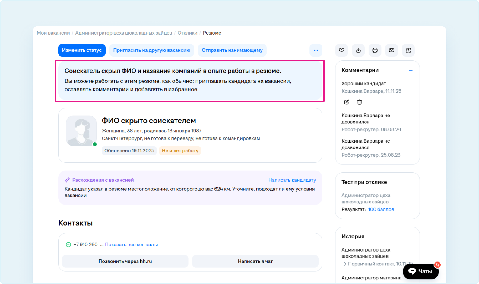 Если вас заинтересовало резюме и кандидат показался подходящим, пригласите его на вакансию или свяжитесь с ним любым доступным способом. Подробнее о способах связи с кандидатом читайте в этой статье.