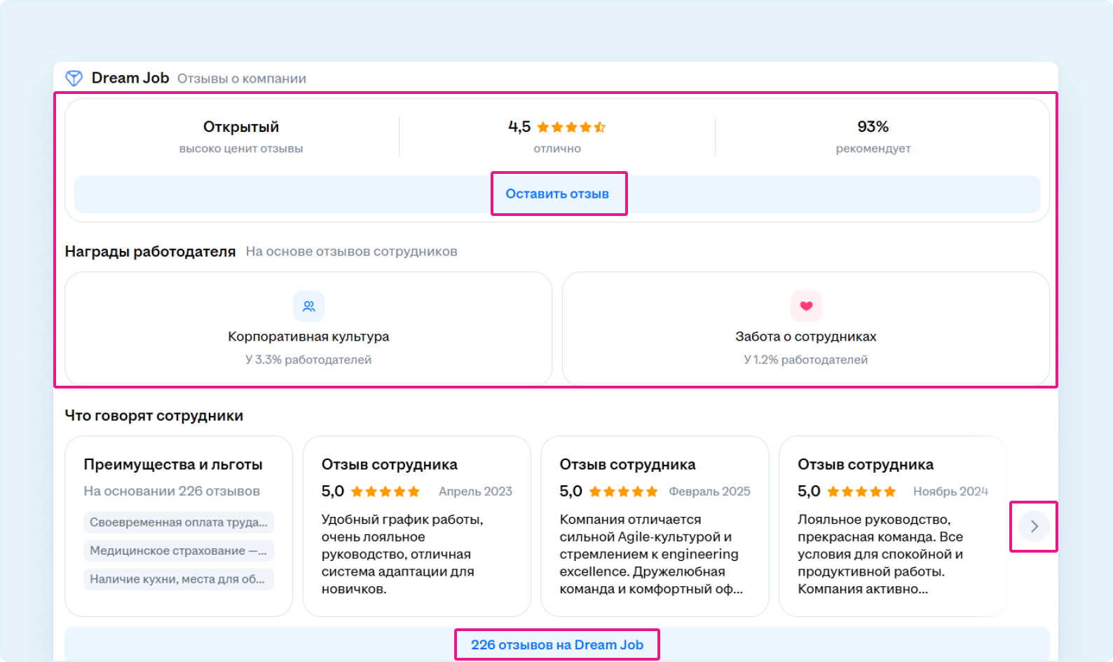 3. Все отзывы о компании соискатель может посмотреть на сайте Dream Job, нажав на фразу «Все отзывы на Dream Job».