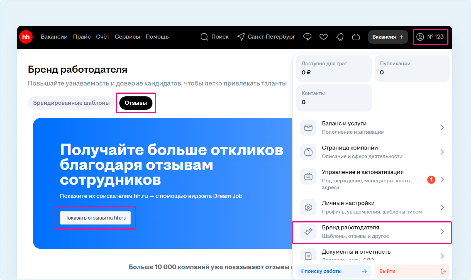 2. Зайдите в раздел меню «Бренд работодателя»→«Отзывы».