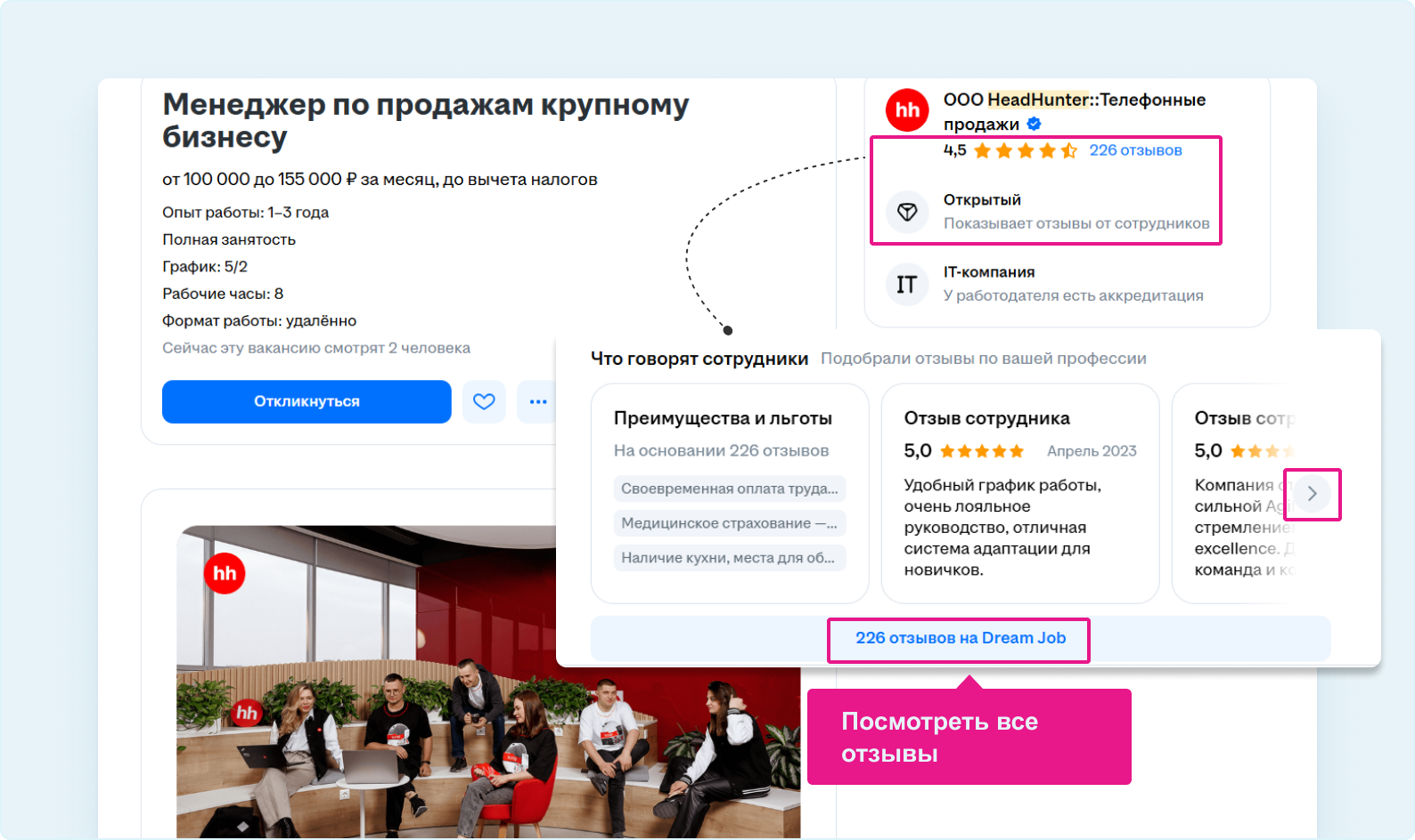 По данным hh.ru, 86% кандидатов перед откликом на вакансию проверяют в интернете информацию о компании. На hh.ru можно подключить виджет от Dream Job с отзывами сотрудников о работодателях.