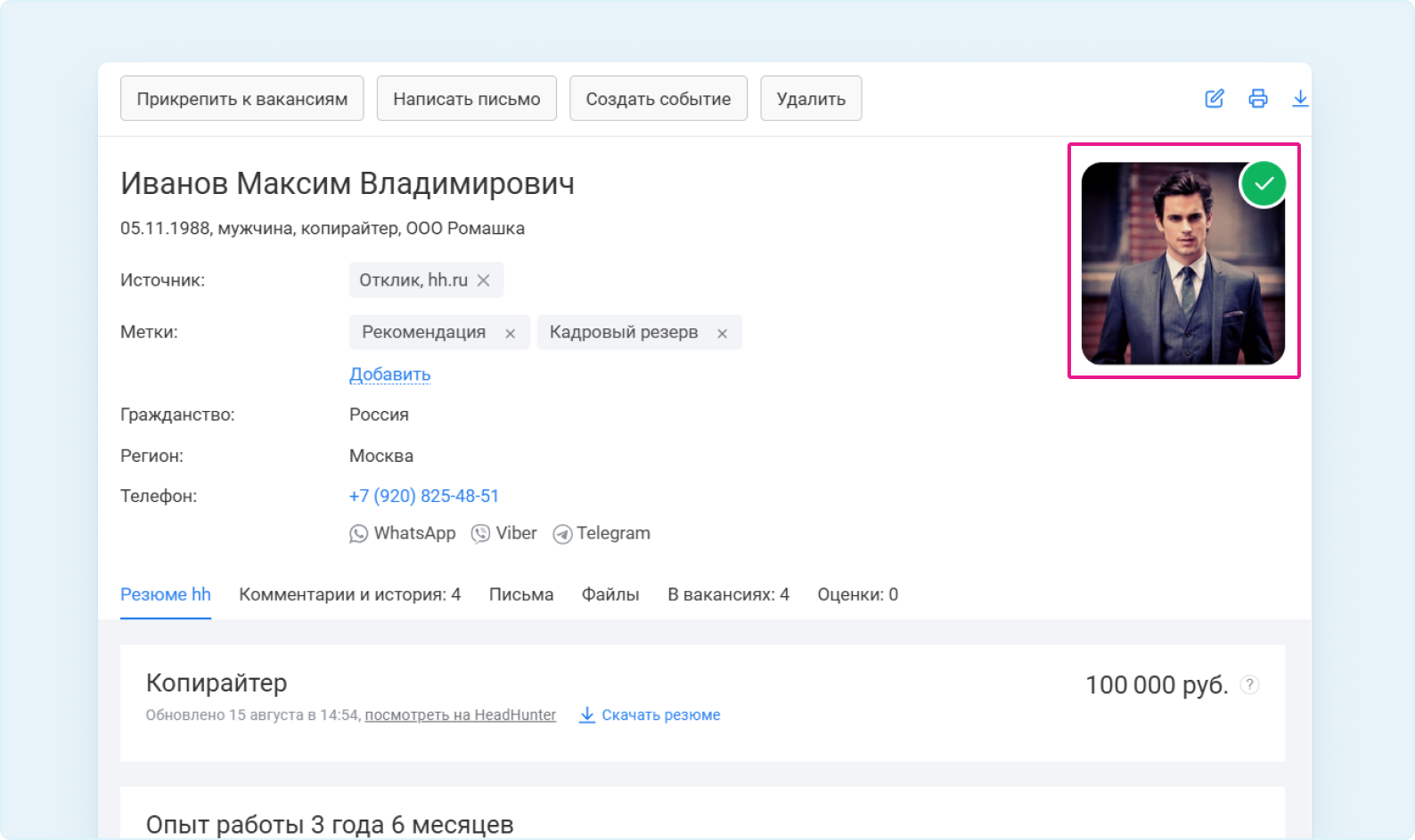 - Согласие получено: в карточке кандидата появится соответствующая отметка.
