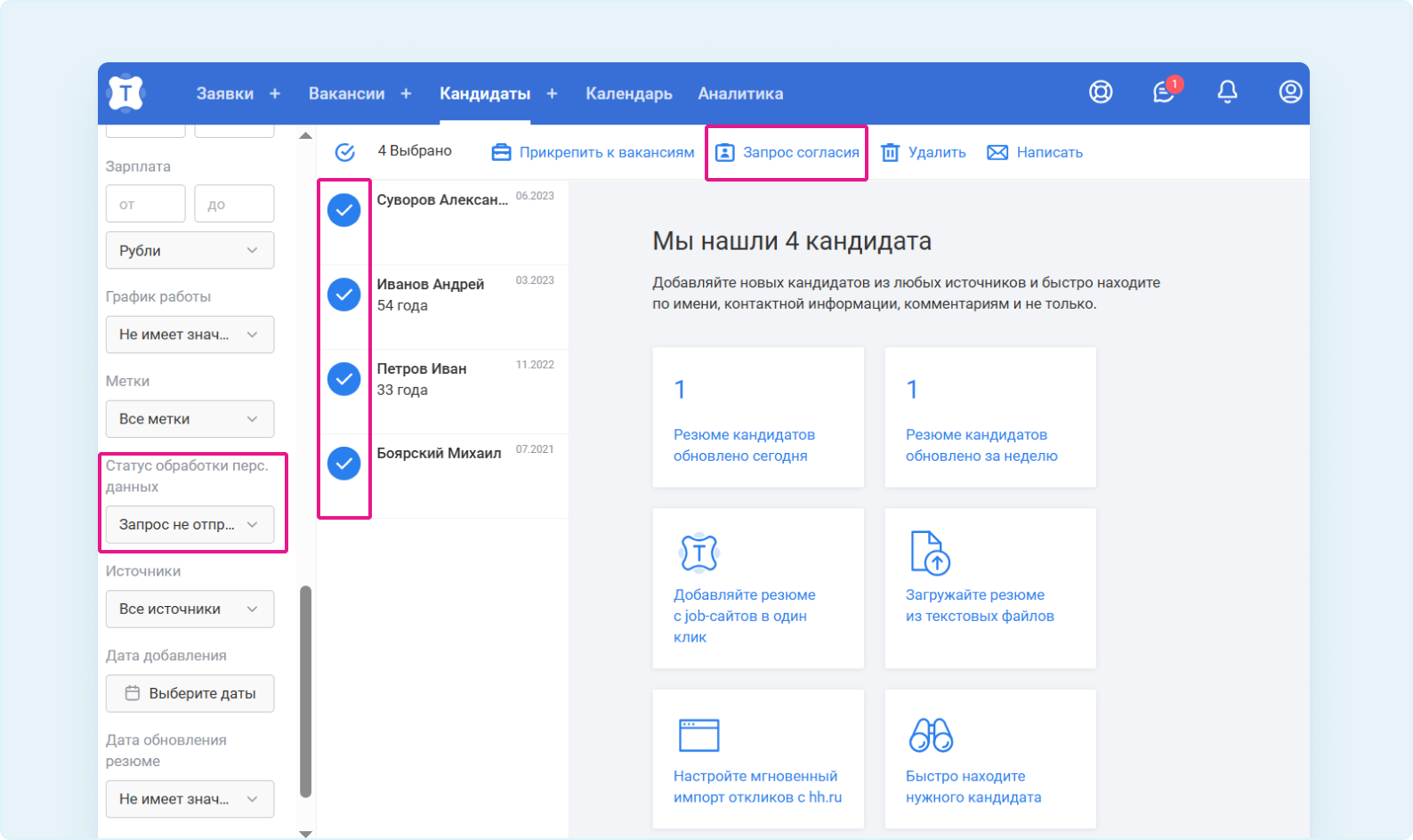 1. В разделе «Кандидаты» выберите фильтр «Статус обработки перс. данных»: «Запрос направлен», «Получено согласие», «Получен отказ», «Запрос не отправлен».