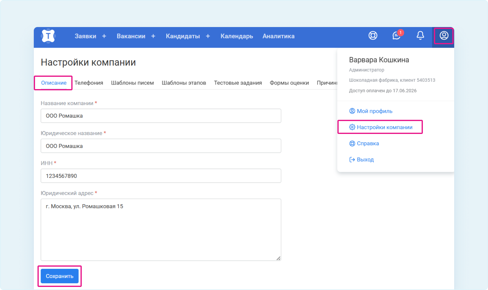 1. Перейдите в раздел «Вакансии», выберите нужную вакансию и кандидата на этапе подбора.