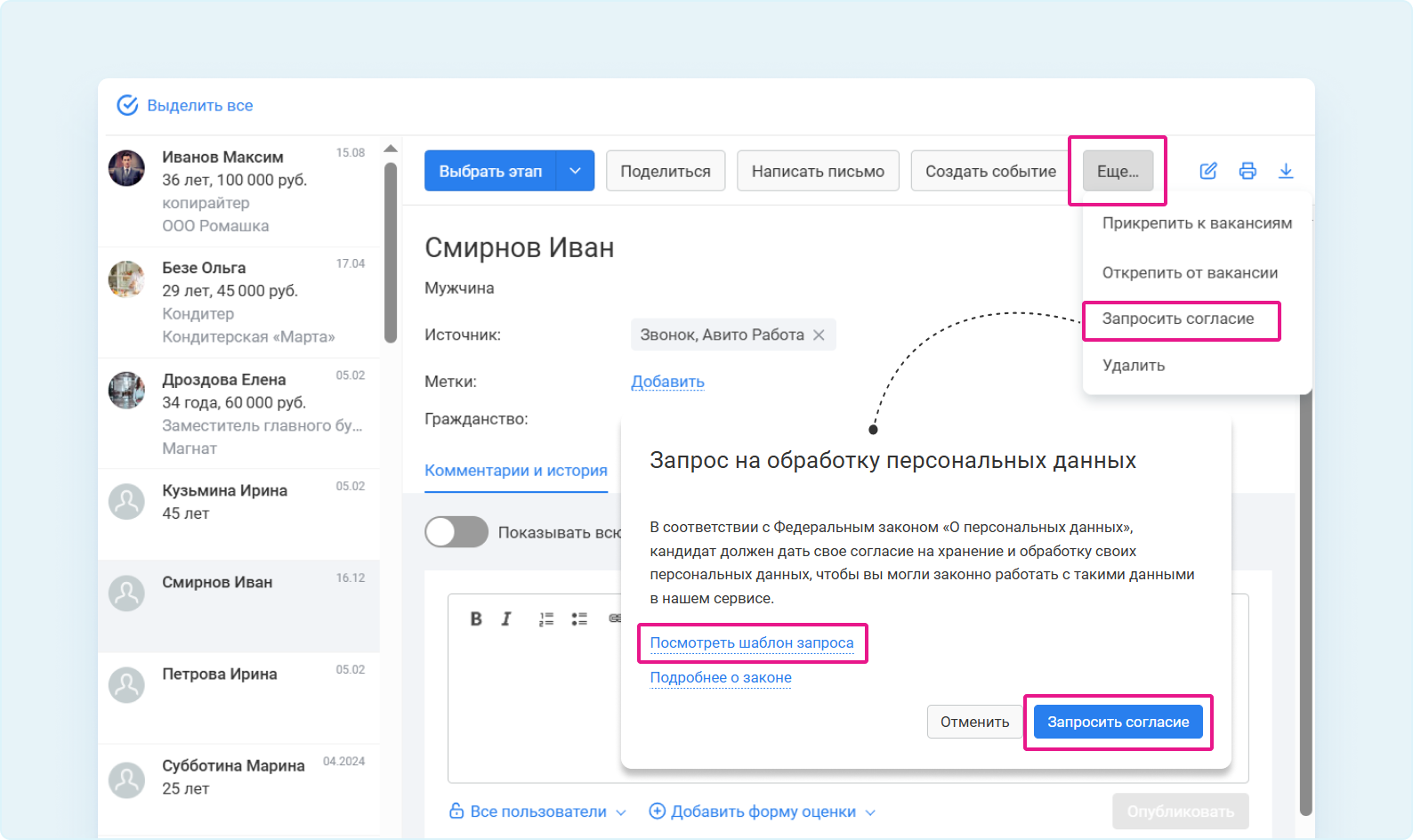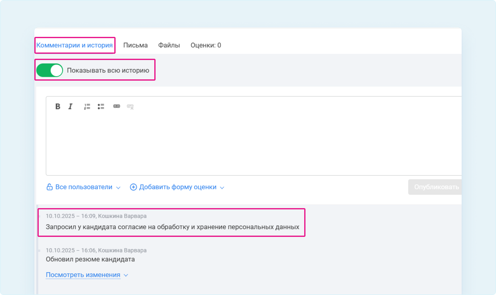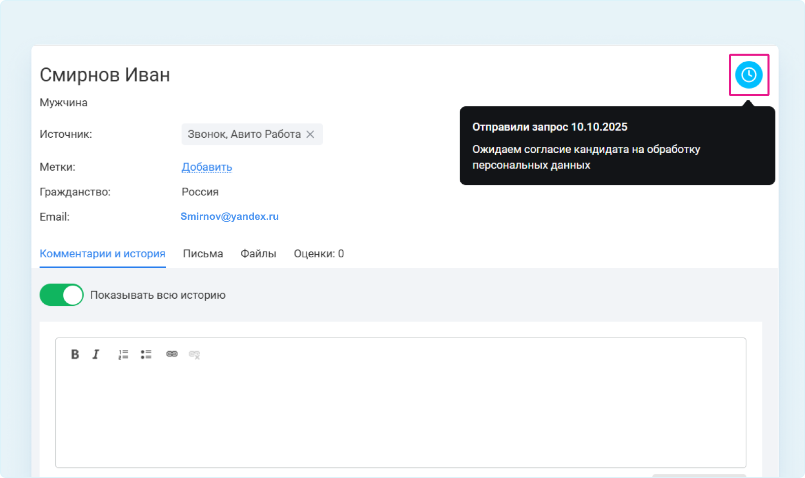 В карточке кандидата во вкладке «Комментарии и история» сохранится запись о том, когда и кем был направлен запрос на согласие.