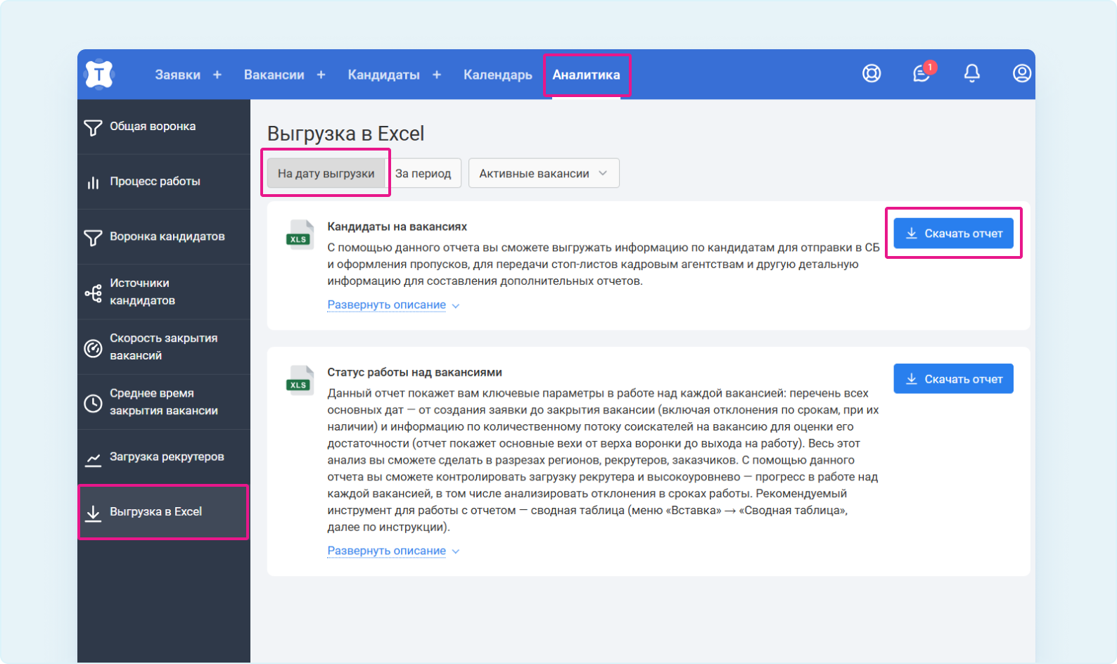 Во вкладке «Аналитика»→ раздел «Выгрузки в Excel», отчёт «Кандидаты на вакансиях».