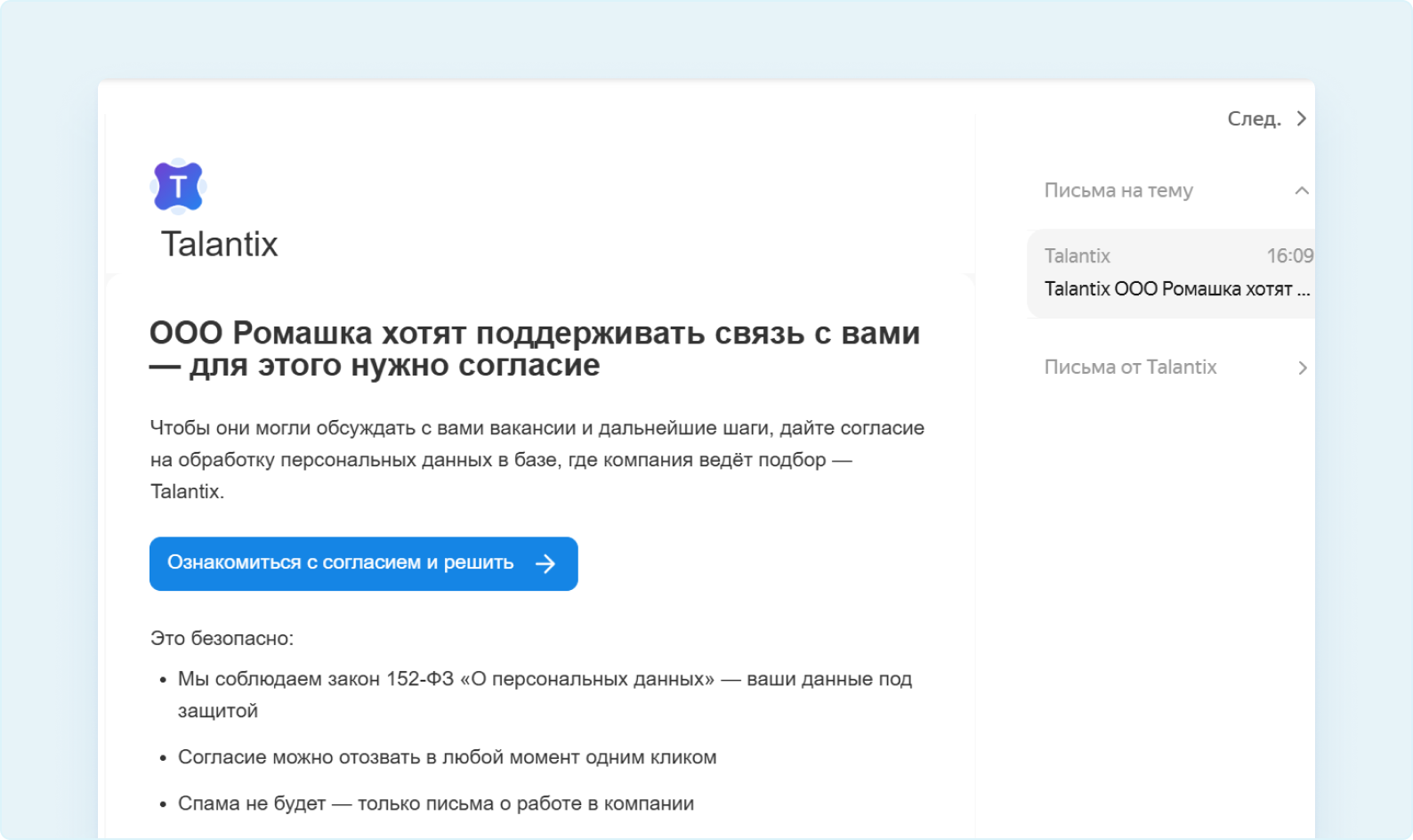 Все кандидаты, которые были добавлены в Talantix из hh.ru, в соответствии с соискательской офертой соглашаются на передачу их персональных данных с hh.ru в Talantix (п. 2.27 Соглашения по содействию в трудоустройстве и иных видах занятости).