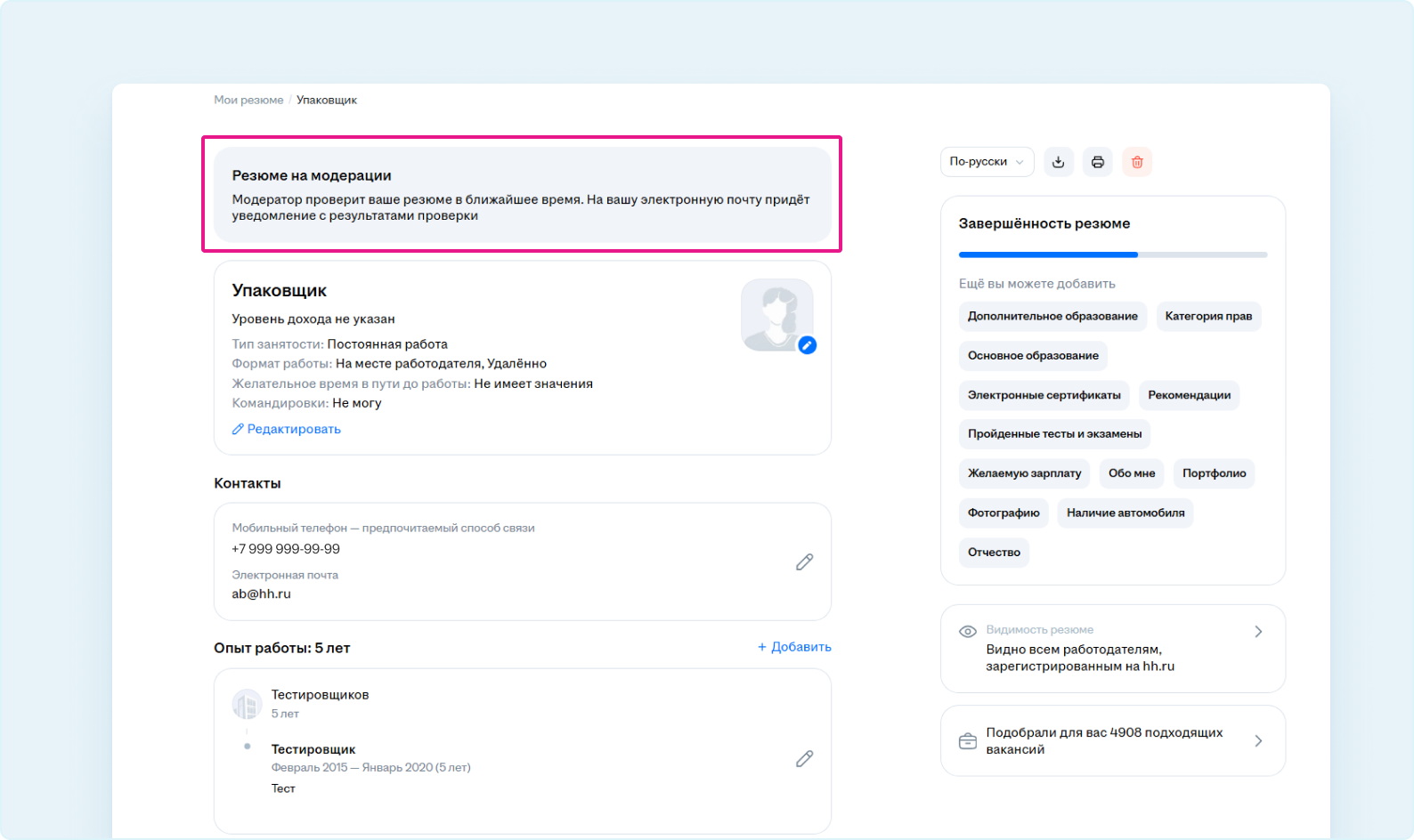 На странице резюме вы увидите уведомление о том, что ваше резюме было отправлено на модерацию.