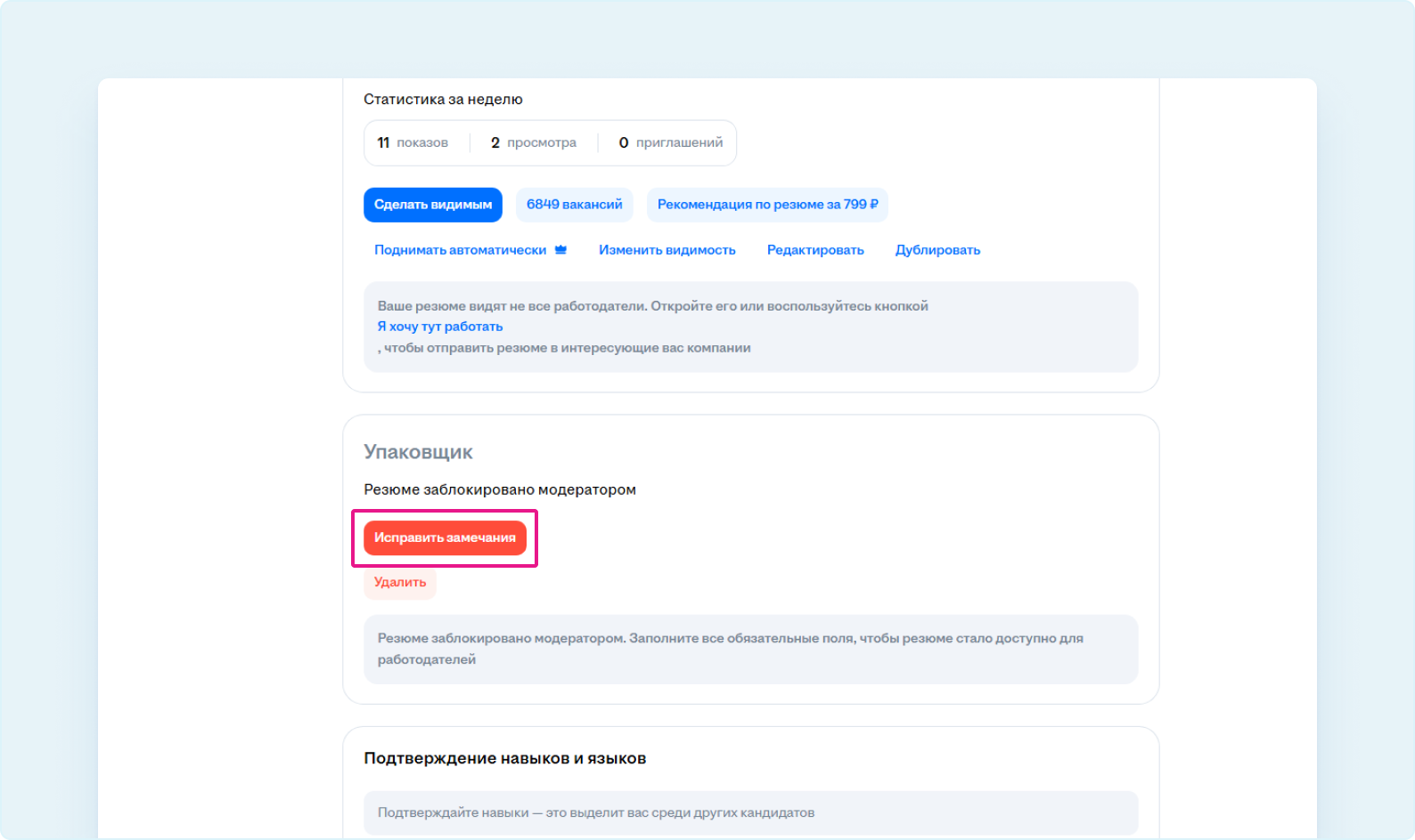 - Или в личном кабинете на hh.ru зайдите в раздел «Резюме и профиль». Под заблокированным резюме нажмите кнопку «Исправить замечания».