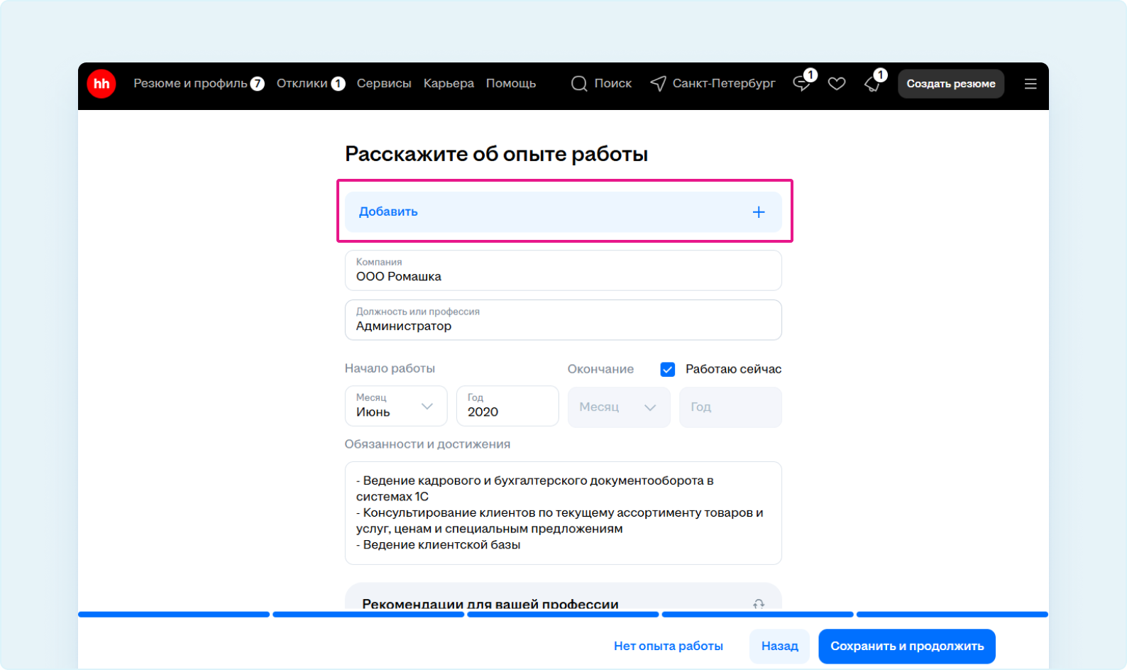 Пример: если вы создаёте резюме в ноябре 2025 года, то должны указать опыт работы, начиная с ноября 2022 года. Или уточнить причины отсутствия опыта работы в разделе «Обо мне». Подробнее о том, как заполнить раздел «Обо мне», можно прочитать здесь.
