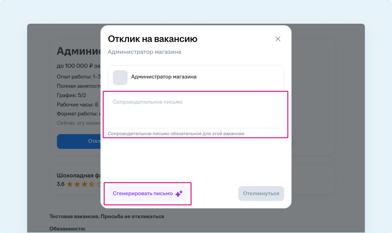 Вы можете отправить сопроводительное письмо сразу после отклика — система перенаправит вас на страницу вакансии.