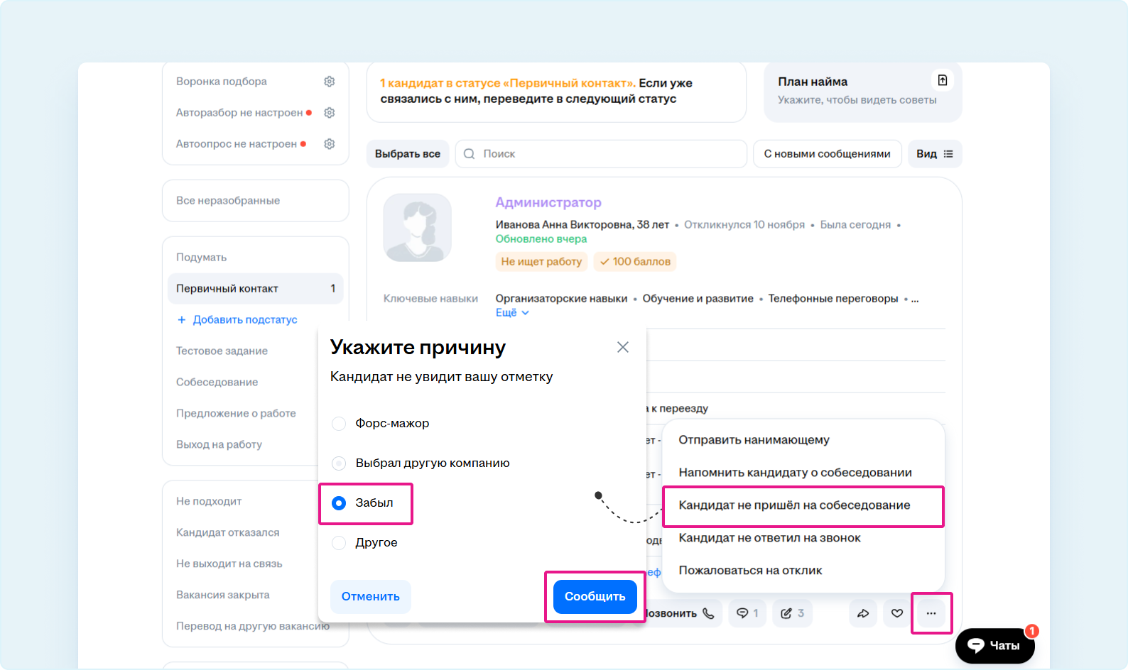 - Выберите пункт «Кандидат не пришёл на собеседование».