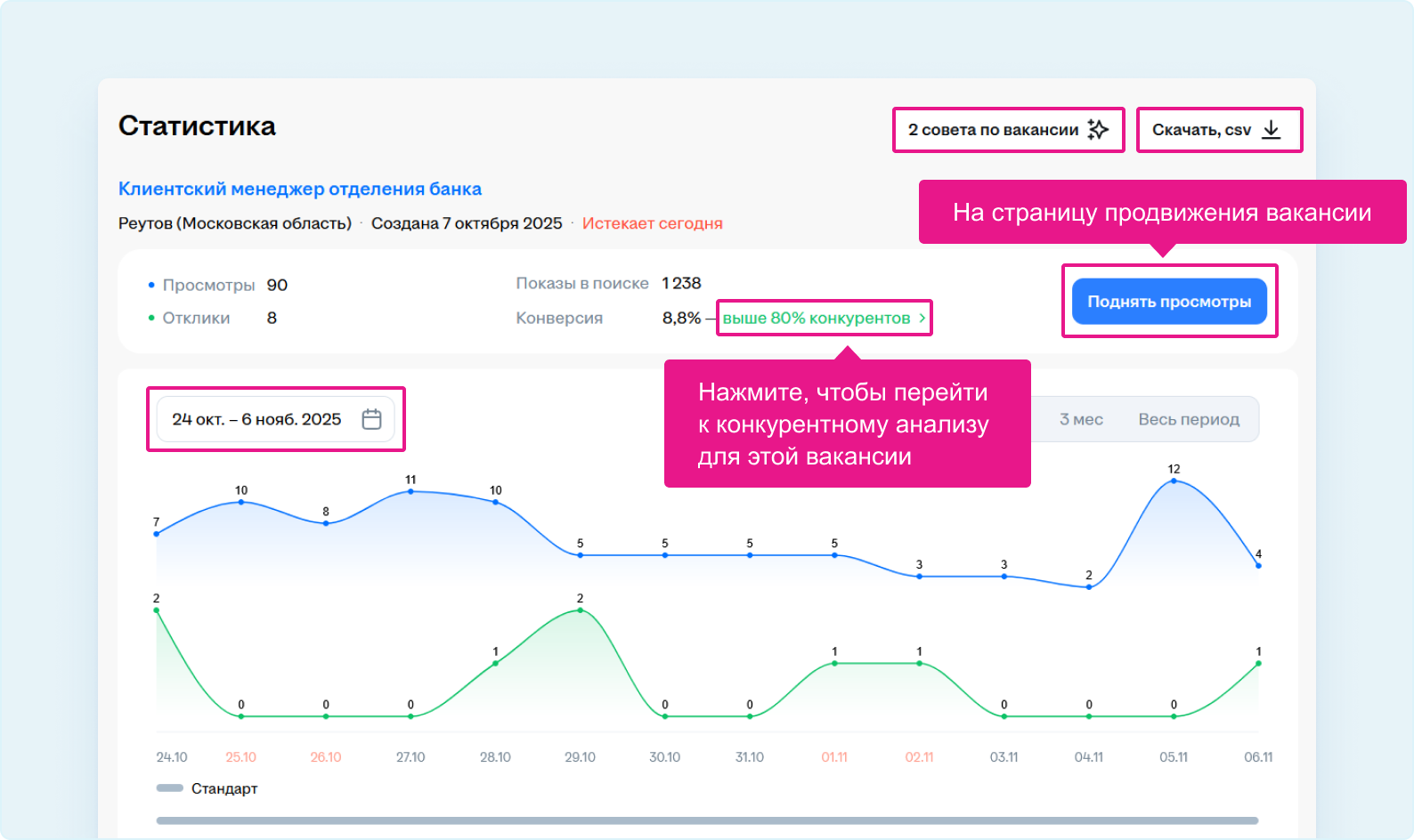 Вы можете скачать отчёт в формате .csv, нажав на кнопку в правом верхнем углу, посмотреть конкурентный анализ, а также перейти на страницу продвижения вакансии.