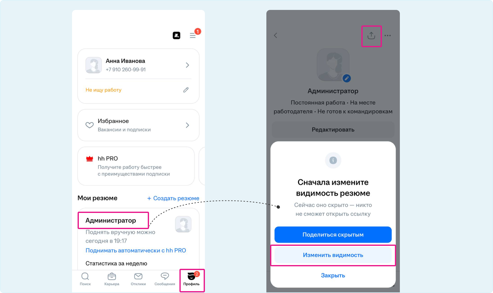 Если ваше резюме скрыто, вы увидите предупреждение. Измените видимость резюме, чтобы получатель смог открыть ссылку.