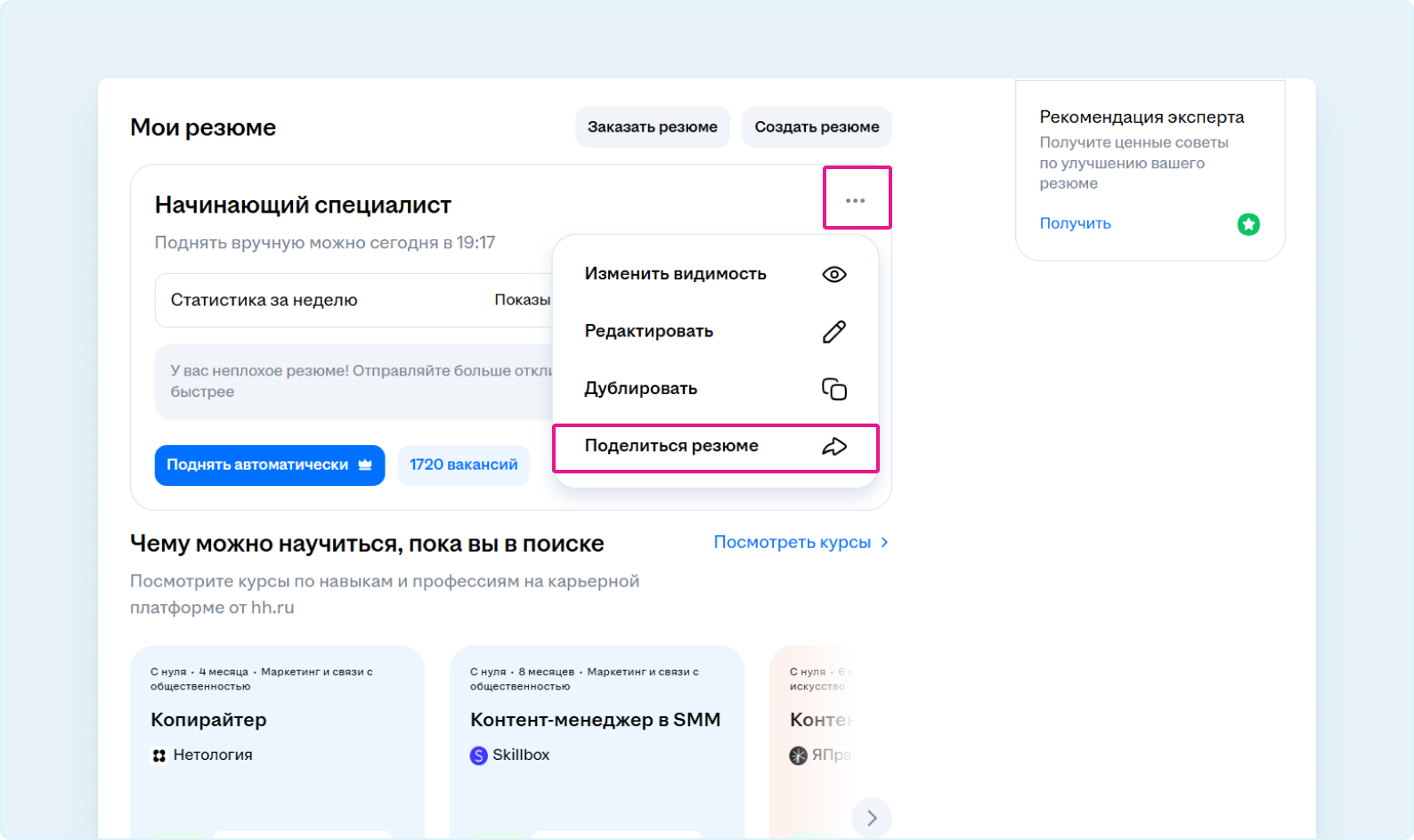 - Найдите нужное резюме и нажмите на три точки в его карточке.