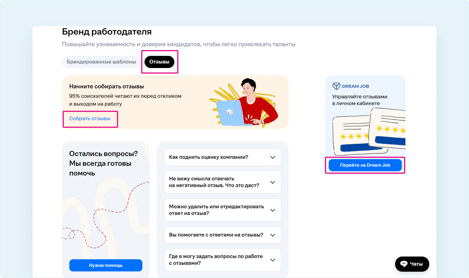 Перейдите на Dream Job из личного кабинета hh.ru, раздел «Бренд работодателя» →«Отзывы» и воспользуйтесь эффективными инструментами для сбора отзывов.