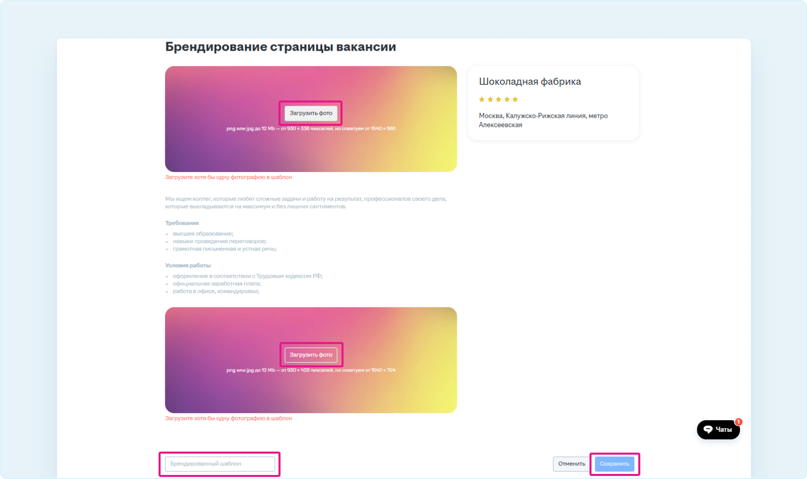 - Загрузите фотографии для шапки и подвала вакансии, нажав «Загрузить фото».