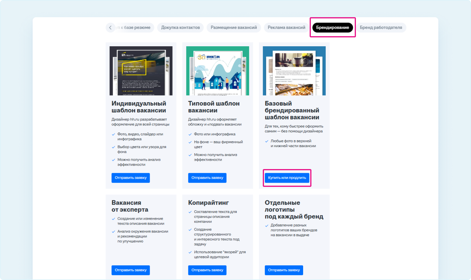1. На странице «Прайс»→«Брендирование» выберите блок «Базовый брендированный шаблон вакансии» и нажмите «Купить или продлить».