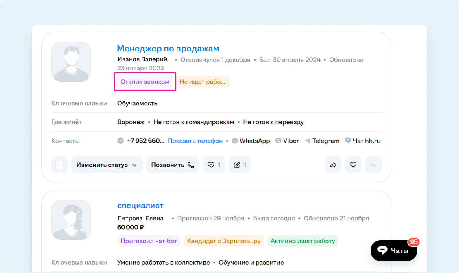 - Кандидат слышит сообщение, что звонок идёт по вакансии с hh.ru, и разговор может записываться.