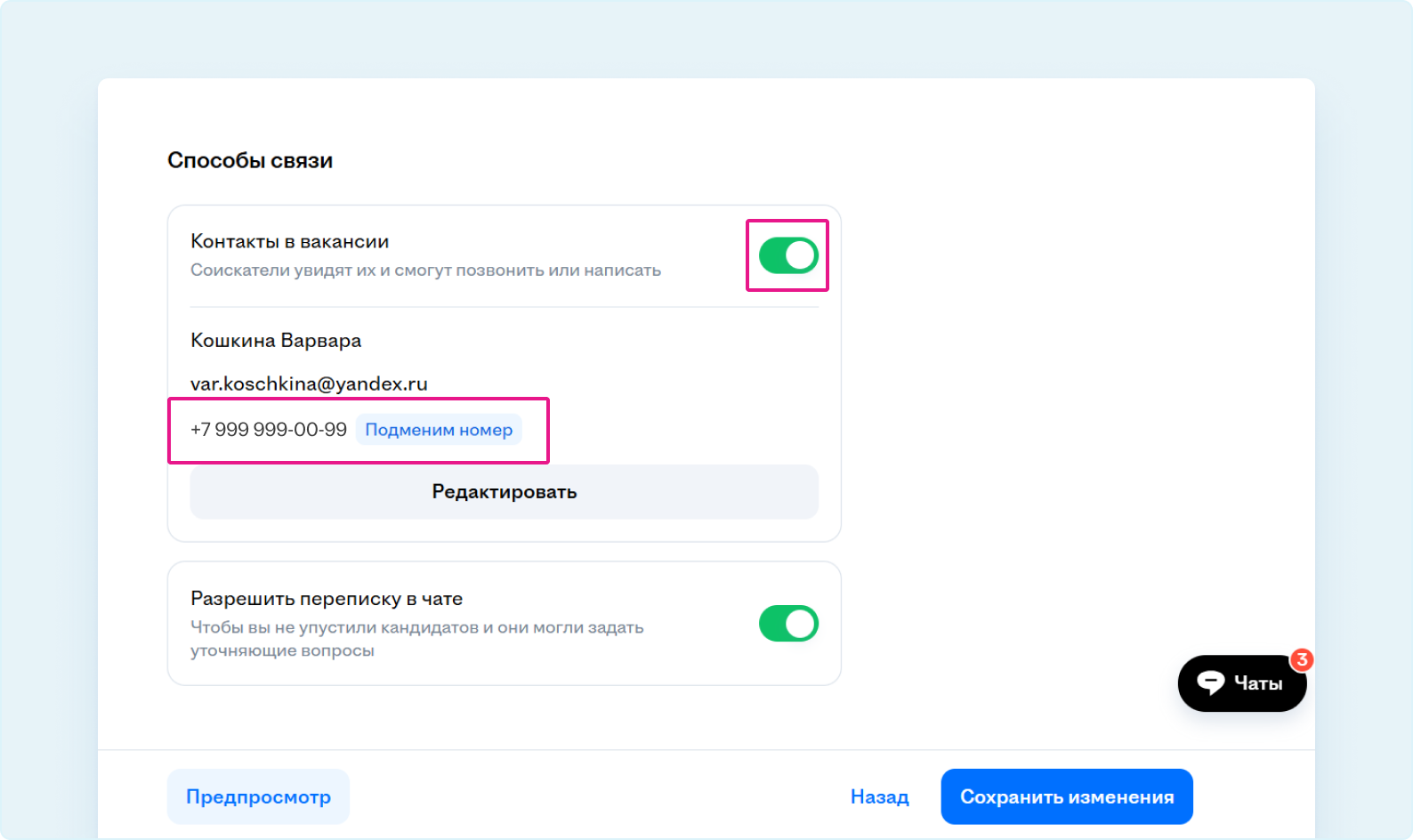 - При создании или редактировании вакансии рекрутер разрешает показывать контакты (переводит тумблер в блоке «Контакты для связи» в активное положение). Номер телефона автоматически заполняется по данным, которые вы указали в разделе «Личные настройки». Если нужно изменить номер телефона, нажмите «Редактировать».