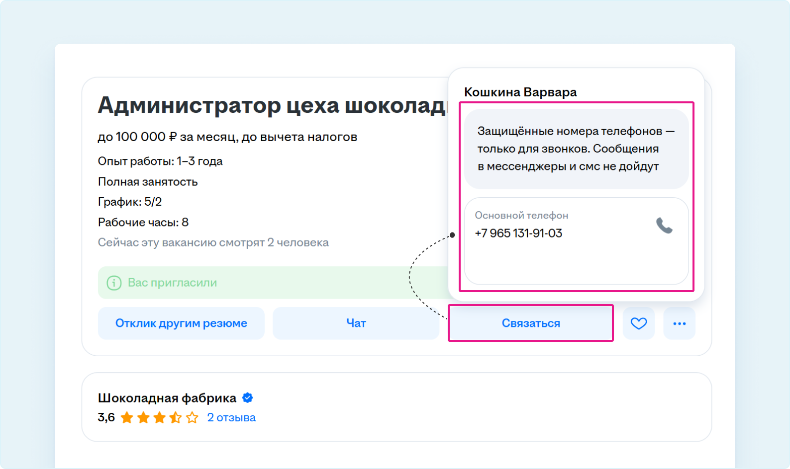 - Соискатель на странице вакансии видит сообщение, что это номер работодателя только для звонков.