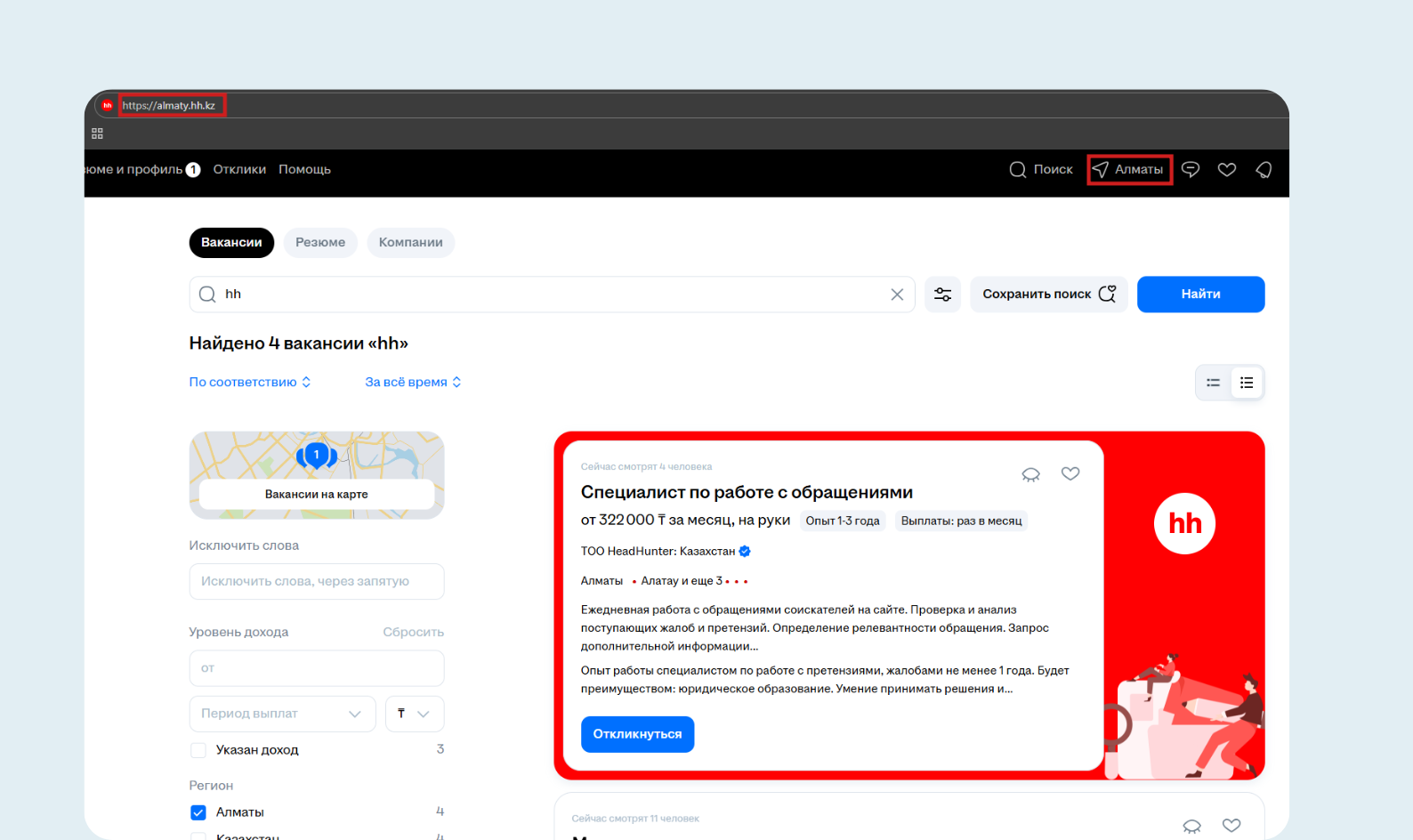 Также может встретиться адрес формата https://город.hh.kz, например https://almaty.hh.kz/